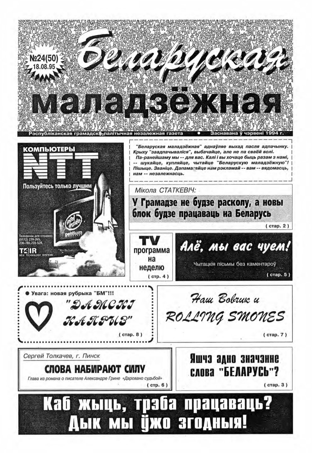 Беларуская маладзёжная (1994 - 2002) - беларуская газэта, дадатак да аднайменнай радыёстанцыі. Зарэгістраваная ў сакавіку 1994 году. У ёй друкаваліся расшыфроўкі радыйных гутарак, анонсы этэраў і ўсё, што не зьмяшчалася ў радыёфармат. Калі радыёстанцыю зачынілі, газэта засталася. Галоўны рэдактар — Тацьцяна Мельнічук. Традыцыйны фармат — 8 старонак А3. Газэта асьвятляла нараджэньне й разьвіцьцё палітычнай апазыцыі сярэдзіны-канца 1990-х... Болей »