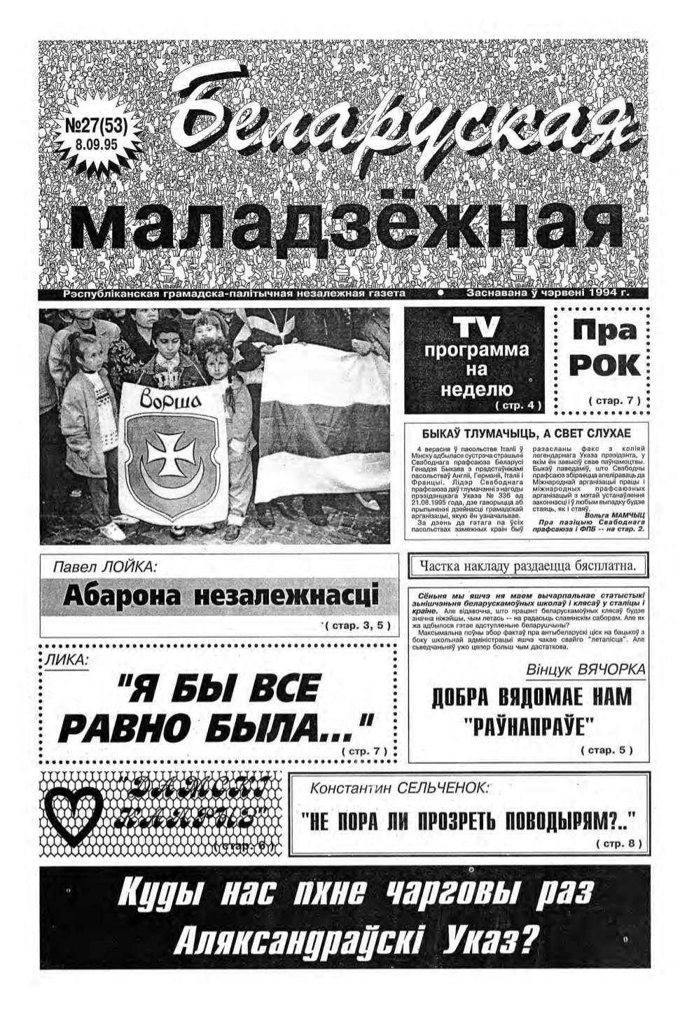 Беларуская маладзёжная (1994 - 2002) - беларуская газэта, дадатак да аднайменнай радыёстанцыі. Зарэгістраваная ў сакавіку 1994 году. У ёй друкаваліся расшыфроўкі радыйных гутарак, анонсы этэраў і ўсё, што не зьмяшчалася ў радыёфармат. Калі радыёстанцыю зачынілі, газэта засталася. Галоўны рэдактар — Тацьцяна Мельнічук. Традыцыйны фармат — 8 старонак А3. Газэта асьвятляла нараджэньне й разьвіцьцё палітычнай апазыцыі сярэдзіны-канца 1990-х... Болей »