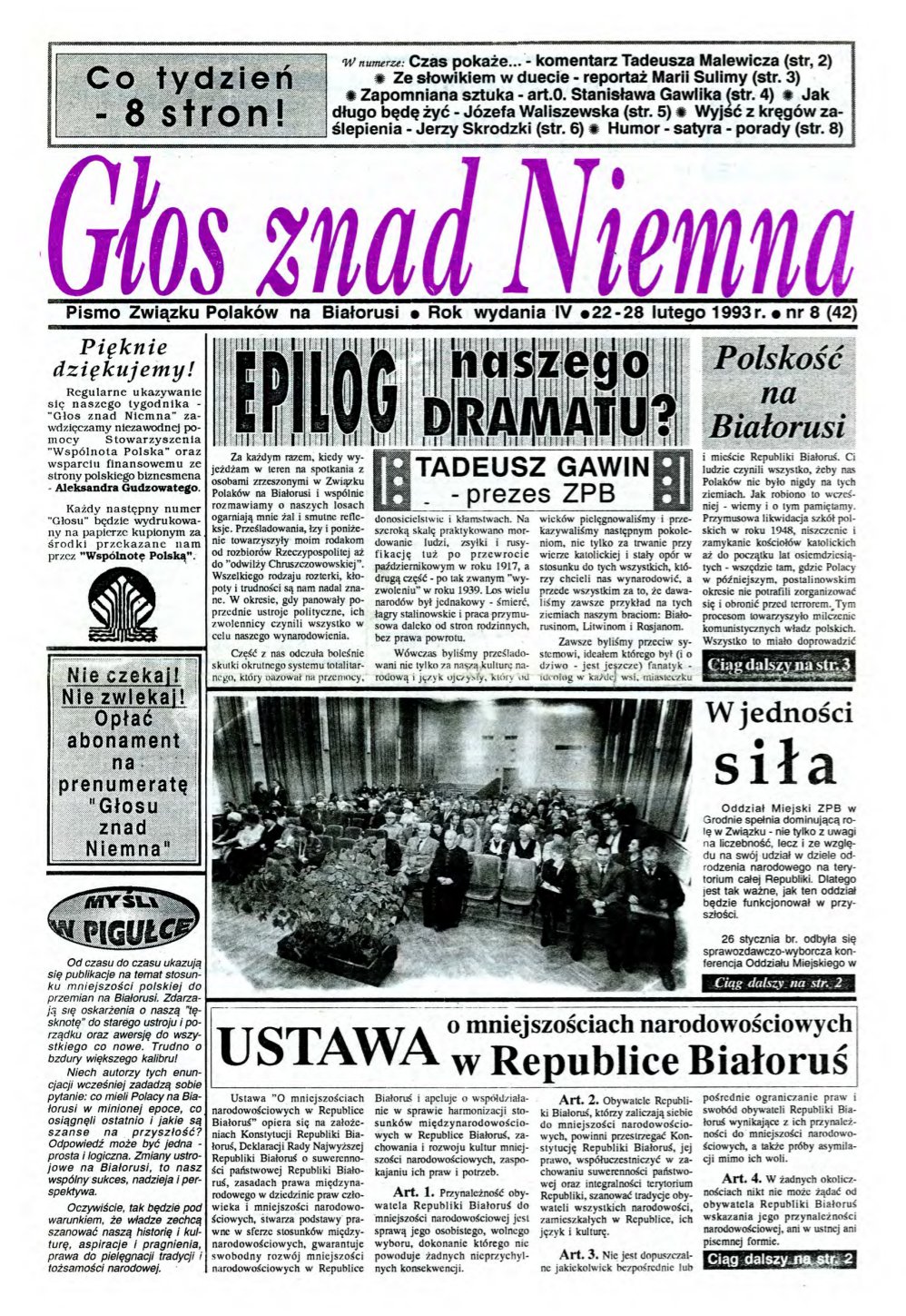 Głos znad Niemna – polskojęzyczny tygodnik wydawany na Białorusi od 3 grudnia 1989 roku; organ prasowy Związku Polaków na Białorusi. Twórcą i pierwszym redaktorem pisma był Eugeniusz Skrobocki z Grodna. Dzięki jego zaangażowaniu pierwsze numery „Głosu znad Niemna” otrzymał Papież Jan Paweł II podczas prywatnej audiencji władz Związku w Watykanie w roku 1990. Pierwszy numer ukazał się jako dodatek specjalny do Czerwonego Sztandaru z okaz... Болей »