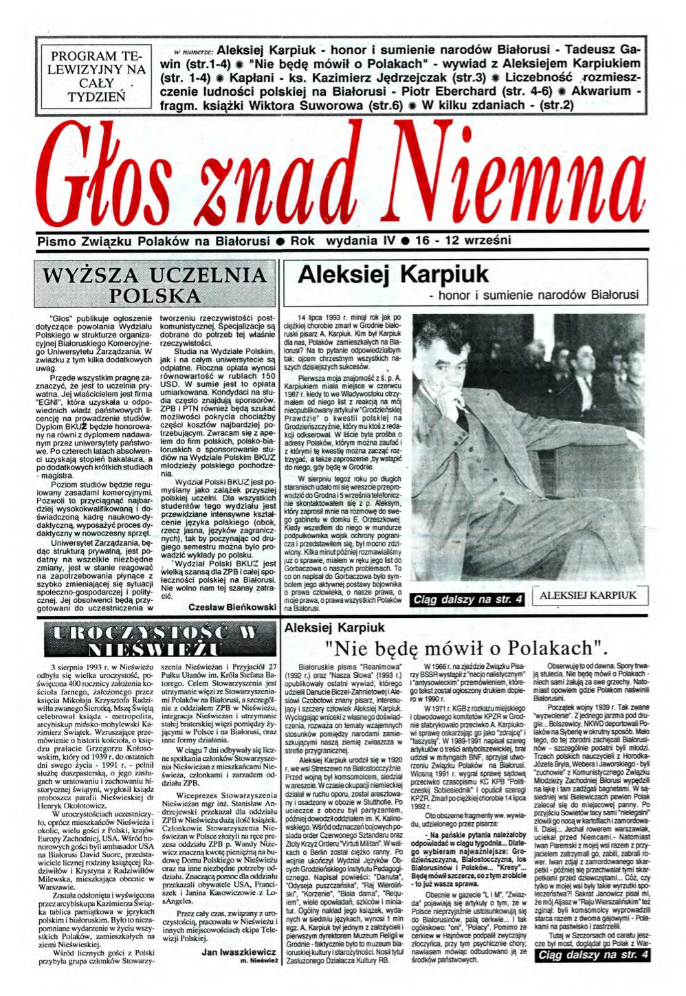 Głos znad Niemna – polskojęzyczny tygodnik wydawany na Białorusi od 3 grudnia 1989 roku; organ prasowy Związku Polaków na Białorusi. Twórcą i pierwszym redaktorem pisma był Eugeniusz Skrobocki z Grodna. Dzięki jego zaangażowaniu pierwsze numery „Głosu znad Niemna” otrzymał Papież Jan Paweł II podczas prywatnej audiencji władz Związku w Watykanie w roku 1990. Pierwszy numer ukazał się jako dodatek specjalny do Czerwonego Sztandaru z okaz... Болей »