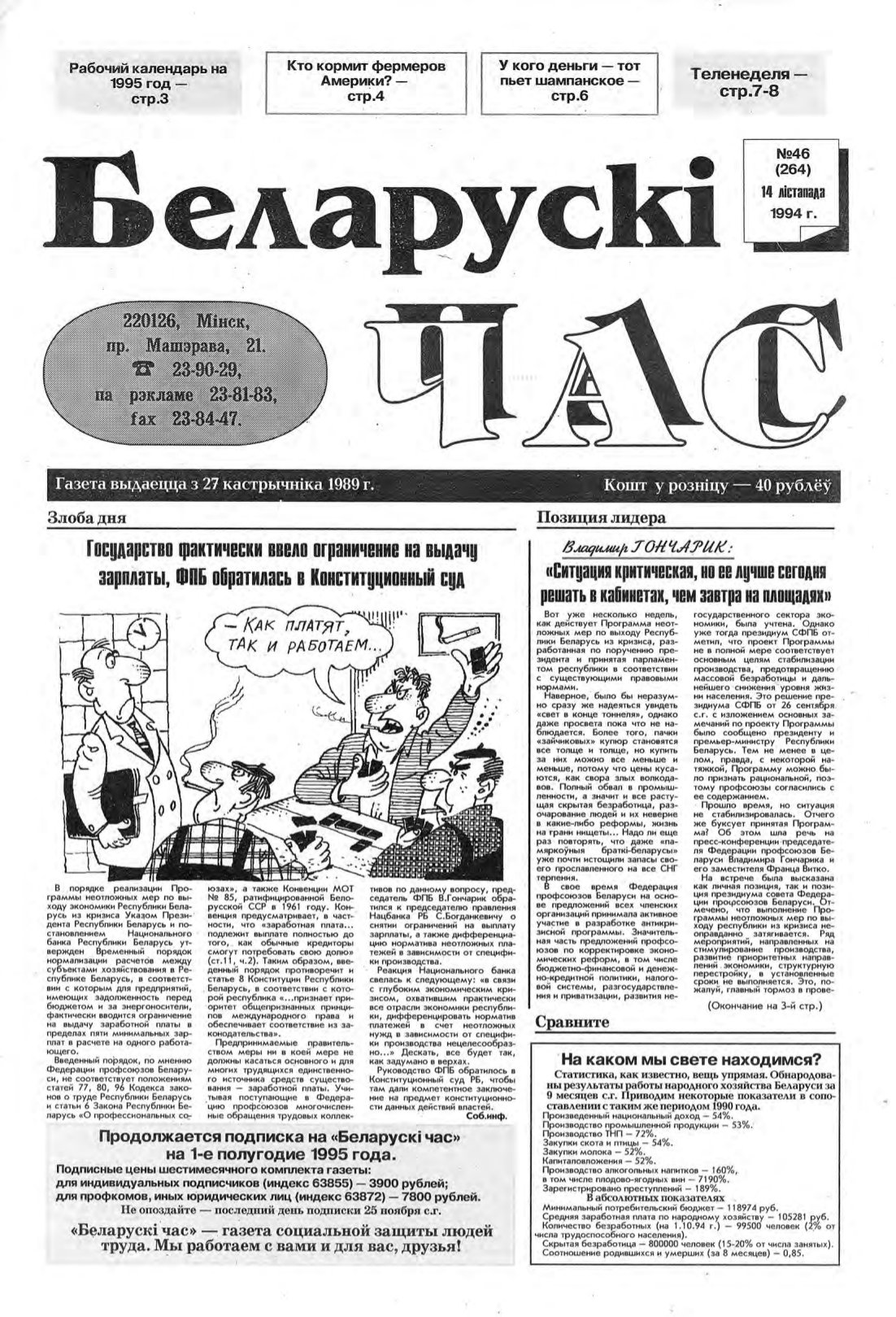 «Беларускі час» — газета савета прафесіянальных саюзаў Беларусі. Заснавальнік: савет Федэрацыі прафсаюзаў Беларусі. Газета выдаецца з 27 кастрычніка 1989 года. Аўтары надрукаваных матэрыялаў нясуць адказнасць за падбор даных, асабістых імён, геаграфічных назваў і іншай інфармацыі, а таксама за тое, калі ў матэрыялах змешчаны даныя, якія не падлягаюць адкрытай публікацыі. Рэдакцыя можа друкаваць артыкулы ў парадку абмеркавання, не падзял... Болей »