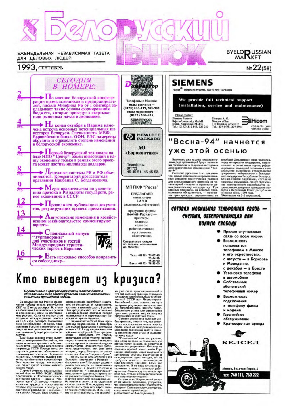 «Белорусский рынок» — независимая индексная газета для деловых людей. Учредитель — МП «Белорусский рынок». Издается при содействии РИА “Новости”. Выходит раз в две недели. Ответственность за точность тгриве-^ денных фактов, цитат, цифр, собственных имен, географических названии и прочихсведенйй^а также за разглашение закрытой информации несут авторы. Редакция может публиковать статьи в порядке обсуждения, не разделяя точку зрения автора.