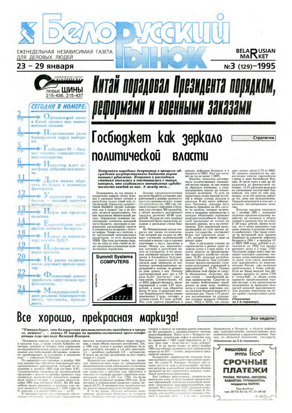 «Белорусский рынок» — еженедельная аналитическая газета для деловых людей. Учредитель — КМП «Белорусский рынок». Издается при содействии РИА “Новости”. Выходит раз в две недели. Ответственность за точность приведенных фактов, цитат, цифр, собственных имен, географических названий и прочих сведенйй а также за разглашение закрытой информации несут авторы. Редакция может публиковать статьи в порядке обсуждения, не разделяя точку зрения авт... Болей »