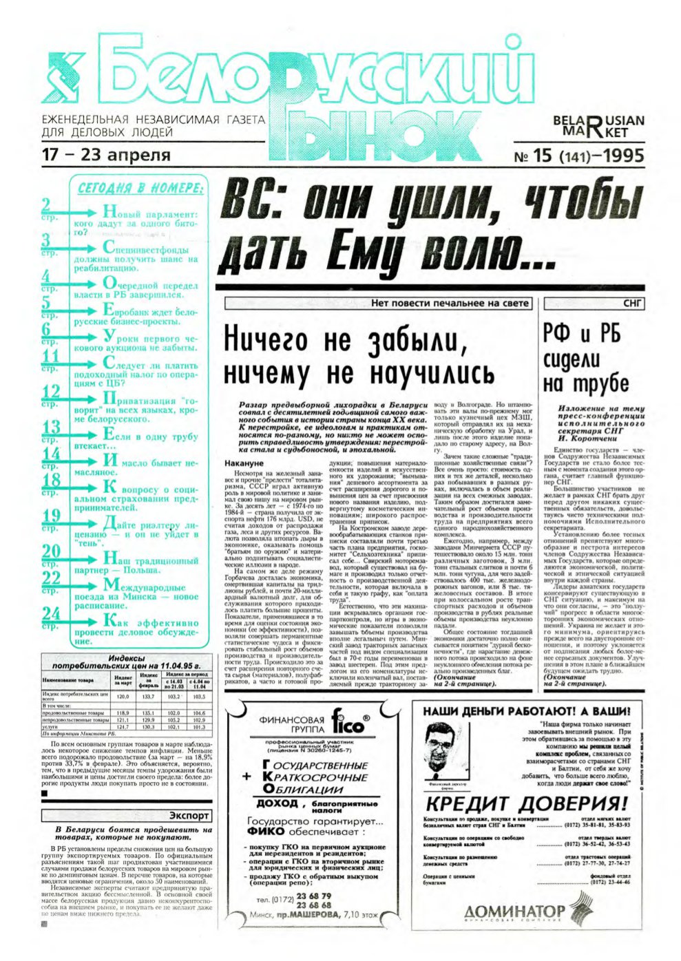 «Белорусский рынок» — независимая индексная газета для деловых людей. Учредитель — МП «Белорусский рынок». Издается при содействии РИА “Новости”. Выходит раз в две недели. Ответственность за точность тгриве-^ денных фактов, цитат, цифр, собственных имен, географических названии и прочихсведенйй^а также за разглашение закрытой информации несут авторы. Редакция может публиковать статьи в порядке обсуждения, не разделяя точку зрения автора.