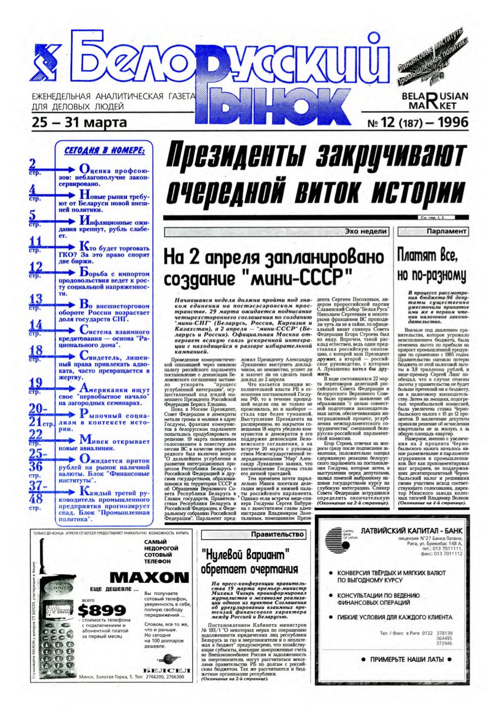«Белорусский рынок» — еженедельная аналитическая газета для деловых людей. Учредитель — КМП «Белорусский рынок». Издается при содействии РИА “Новости”. Выходит раз в две недели. Ответственность за точность приведенных фактов, цитат, цифр, собственных имен, географических названий и прочих сведенйй а также за разглашение закрытой информации несут авторы. Редакция может публиковать статьи в порядке обсуждения, не разделяя точку зрения авт... Болей »