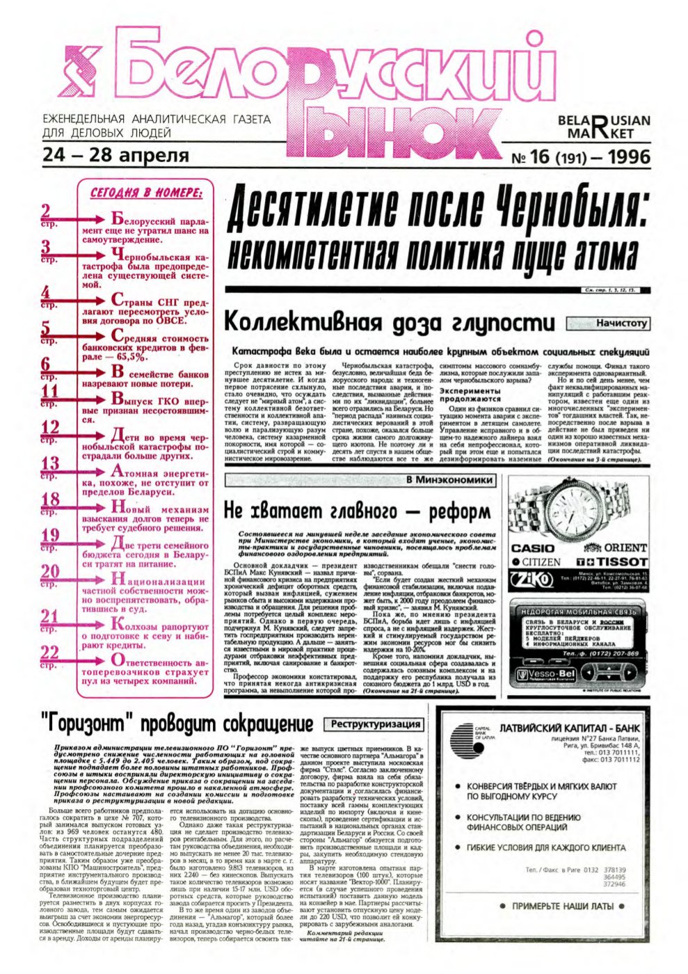 «Белорусский рынок» — еженедельная аналитическая газета для деловых людей. Учредитель — КМП «Белорусский рынок». Издается при содействии РИА “Новости”. Выходит раз в две недели. Ответственность за точность приведенных фактов, цитат, цифр, собственных имен, географических названий и прочих сведенйй а также за разглашение закрытой информации несут авторы. Редакция может публиковать статьи в порядке обсуждения, не разделяя точку зрения авт... Болей »