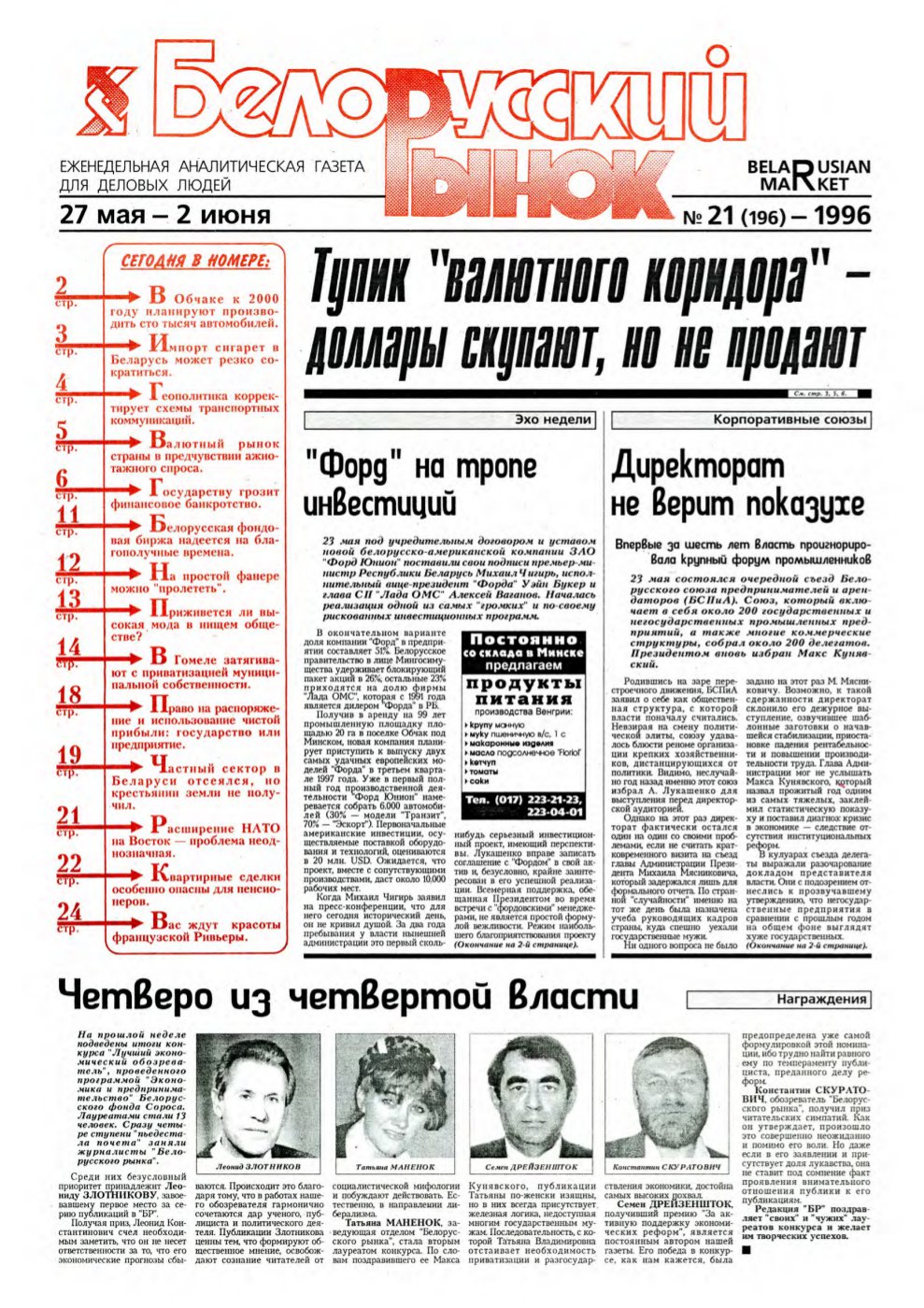 «Белорусский рынок» — еженедельная аналитическая газета для деловых людей. Учредитель — КМП «Белорусский рынок». Издается при содействии РИА “Новости”. Выходит раз в две недели. Ответственность за точность приведенных фактов, цитат, цифр, собственных имен, географических названий и прочих сведенйй а также за разглашение закрытой информации несут авторы. Редакция может публиковать статьи в порядке обсуждения, не разделяя точку зрения авт... Болей »