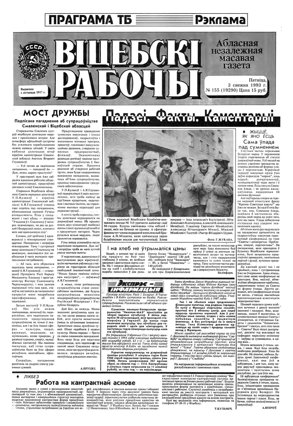 «Віцебскі рабочы» — абласная незалежная масавая газета. Заснавальнікі: Віцебскі абласны Выканаўчы камітэт і калектыў рэдакцыі. Выдаецца з лістапада 1917 года на беларускай і рускай мовах. Аўтары апублікаваных матэрыялаў нясуць адказнасць за падбор і дакладнасць фактаў. Іх меркаванні неабавязкова адлюстроўваюць пункт гледжання рэдакцыі. Газета выходзіць па аўторках, серадах, пятніцах і суботах. Болей »