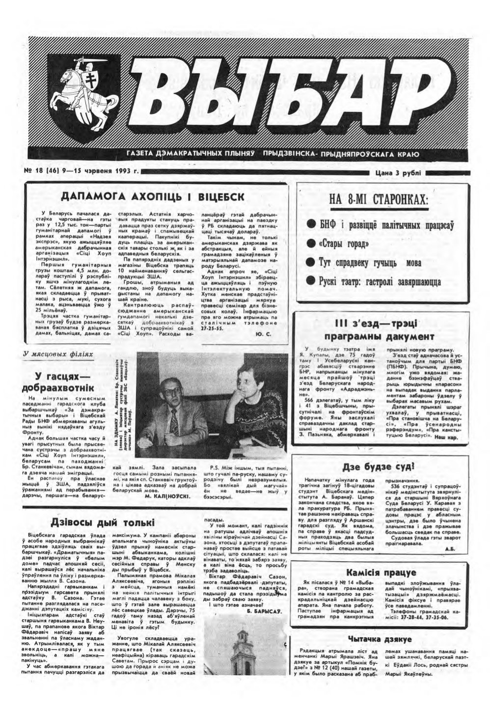 Газэта “Выбар” выдавалася ў Віцебску з 1991 году. Гэта бадай самае першае віцебскае дэмакратычнае выданьне. Сваю мэту рэдакцыя газэты ў яе першым нумары з 2 кастрычніка 1991 году фармулявала наступным чынам: Будзем дапамагаць новым і перагленуўшым свае мінулыя пазыцыі старым грамадзкім сілам выцягваць Беларусь з 73-гадовай пустыні, падносіць з каленяў змучаны і чакаючы чарговых сацыяльна-эканамічных крызісаў народ для пабудовы сапраўдна... Болей »