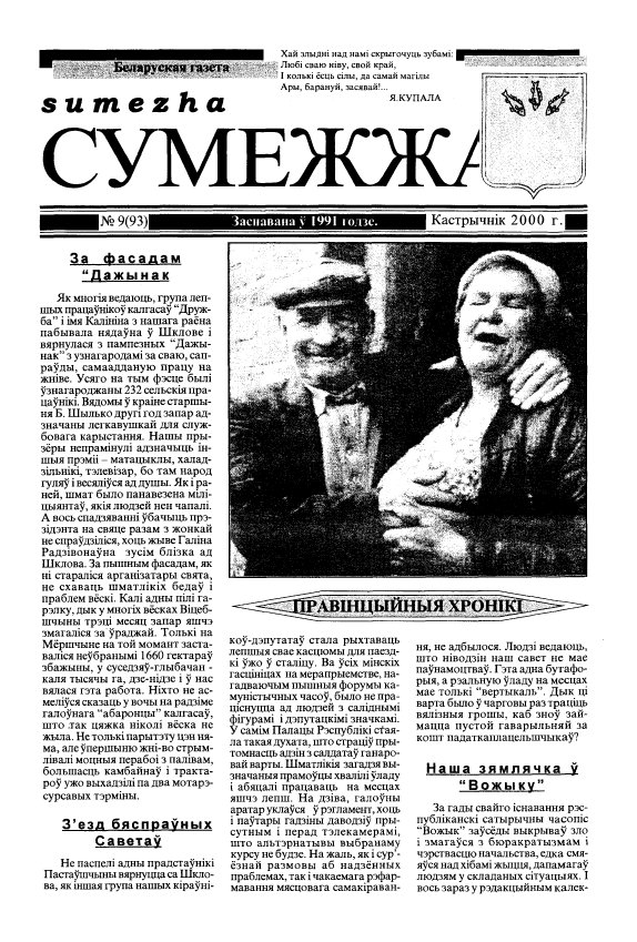 «Сумежжа» — Пастаўская незалежная газета. Заснавальнікі: Беларуская сацыял-дэмакратычная Грамада, Таварыства Беларускай Мовы імя Францішка Скарыны. Рэдакцыя друкуе матэрыялы аўтараў, пазіцыю якіх не заўжды падзяляе. Болей »