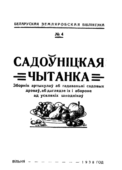 Гэтая кніга належыць да бібліятэкі сучаснага Віленскага Беларускага Музэю імя Івана Луцкевіча. Садоўніцкая чытанка (зборнік артыкулаў аб гадаваньні садовых дрэваў, аб даглядзе іх і абароне ад усялякіх шкоднікаў). /Аўтары: Іван Сікора, Мікалай Караленка [= М.К.], іншыя адзачаныя ініцыяламі: В.Р., А.В., інж. А.К. [=Адольф Клімовіч], С.С., інж. О.Д., Л.М. Вільня: Самапомач, 1938. – 88 стр. Па асобніку зь бібліятэкі Язэпа Шнаркевіча.