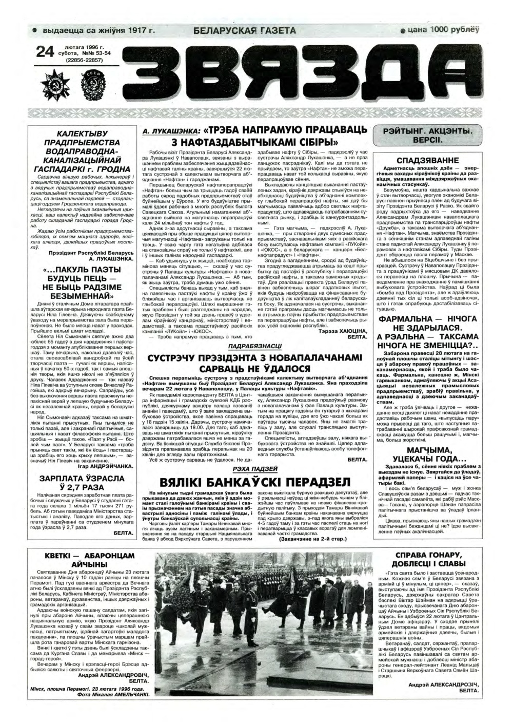 «Звязда» — Беларуская газэта. Выходзіць 250 разоў на год. Аўтары апублікаваных матэрыялаў нясуць адказнасць за падбор і дакладнасць фактаў. Іх меркаванні неабавязкова адлюстроўваюць пункт гледжання рэдакцыі. Болей »