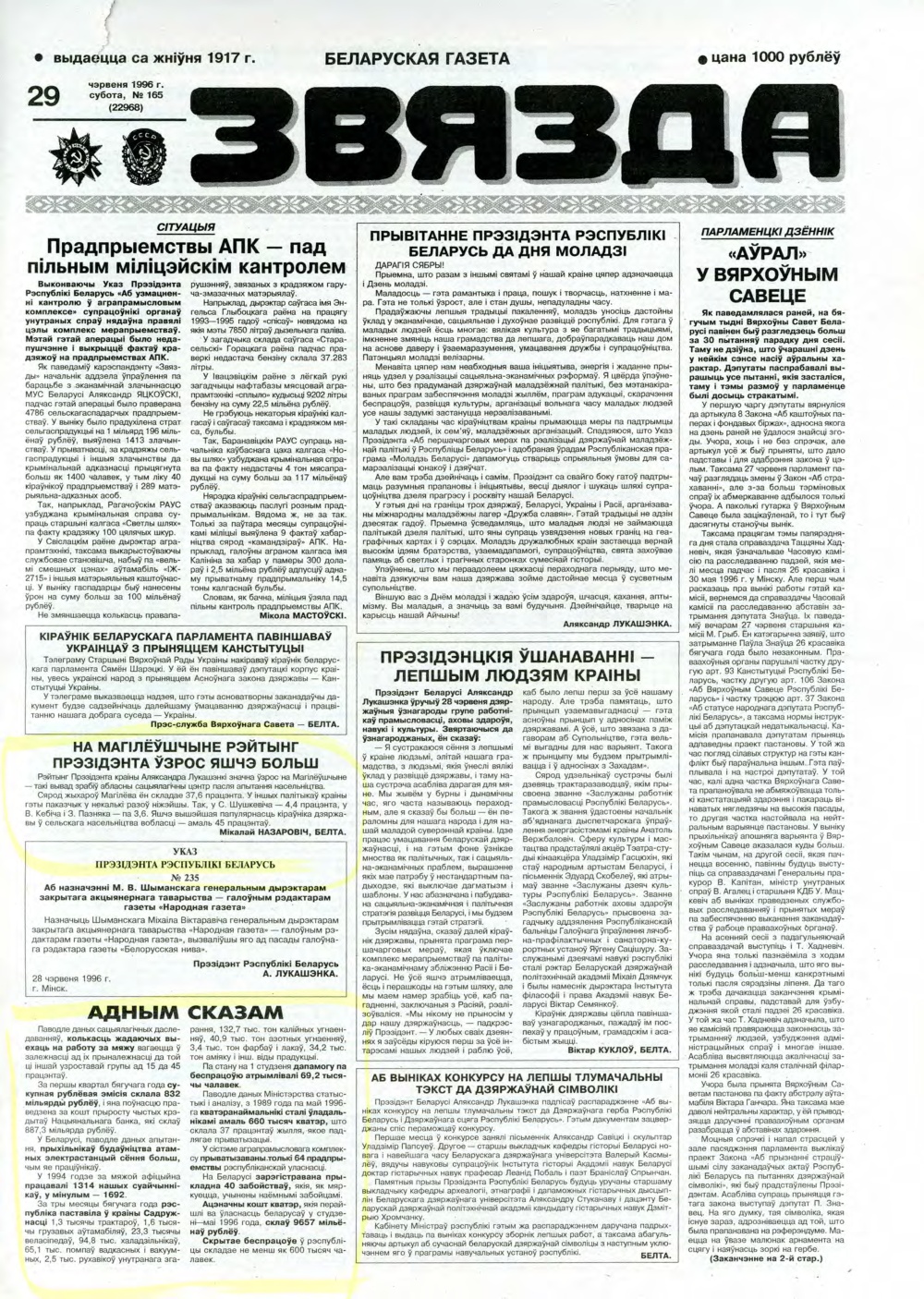 «Звязда» — орган Цэнтральнага Камітэта Камуністычнай партыі Беларусі, Вярхоўнага Савета і Савета Міністраў Беларускай ССР. Выходзіць 250 разоў на год. Аўтары апублікаваных матэрыялаў нясуць адказнасць за падбор і дакладнасць фактаў. Іх меркаванні неабавязкова адлюстроўваюць пункт гледжання рэдакцыі. Болей »