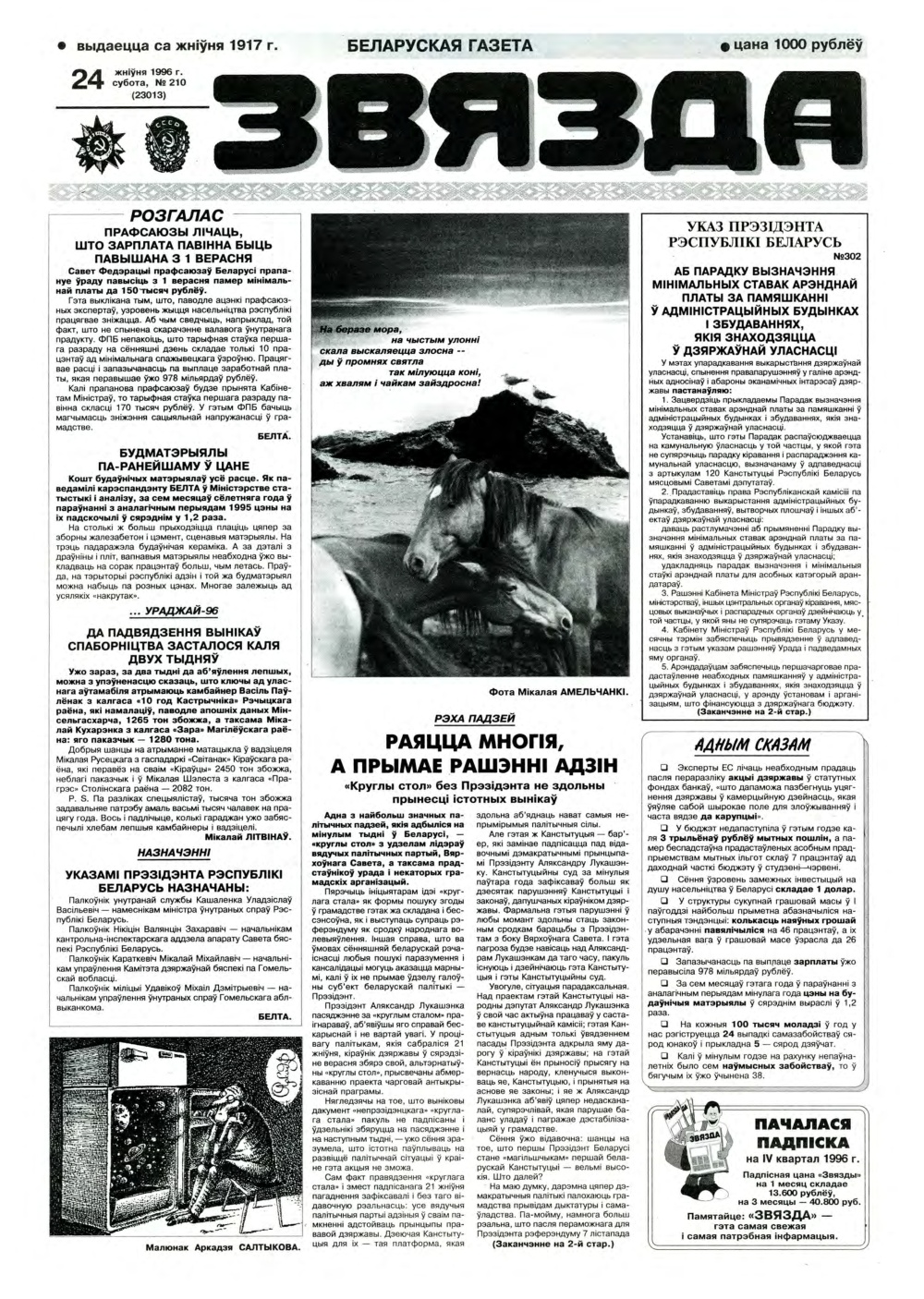 «Звязда» — Беларуская газэта. Выходзіць 250 разоў на год. Аўтары апублікаваных матэрыялаў нясуць адказнасць за падбор і дакладнасць фактаў. Іх меркаванні неабавязкова адлюстроўваюць пункт гледжання рэдакцыі. Болей »