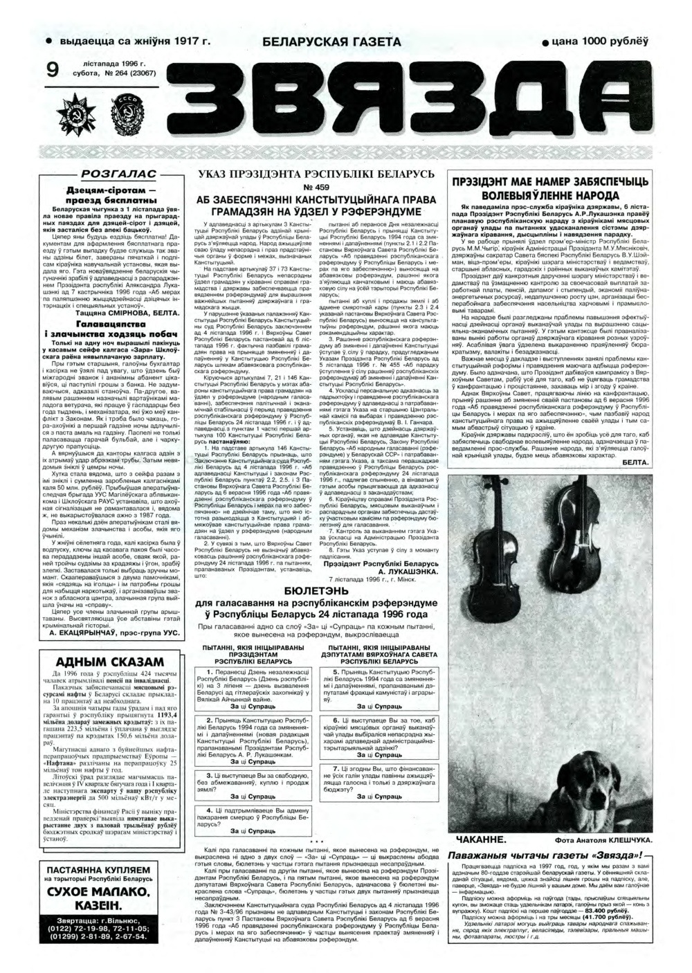 «Звязда» — Беларуская газэта. Выходзіць 250 разоў на год. Аўтары апублікаваных матэрыялаў нясуць адказнасць за падбор і дакладнасць фактаў. Іх меркаванні неабавязкова адлюстроўваюць пункт гледжання рэдакцыі. Болей »