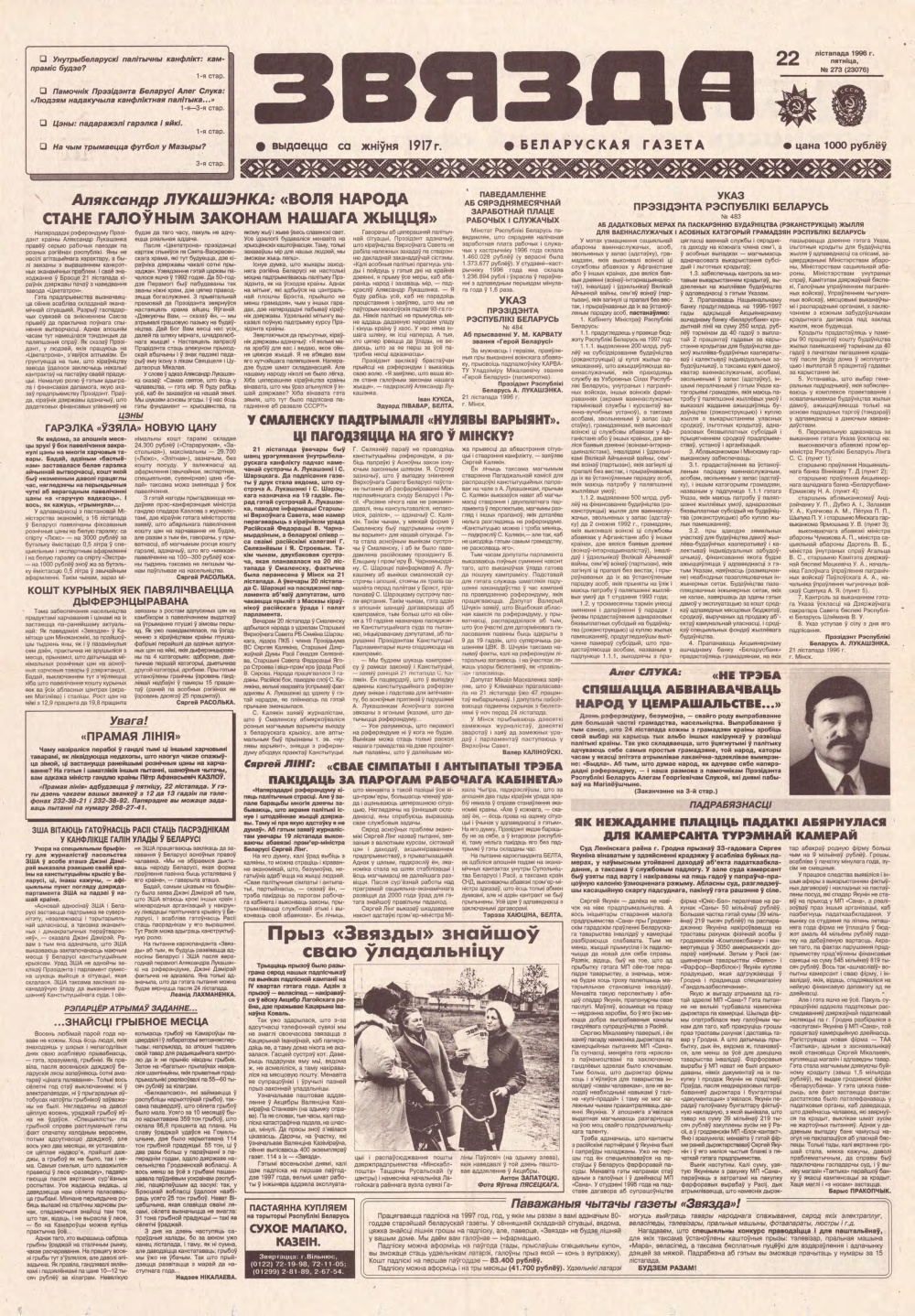 «Звязда» — орган Цэнтральнага Камітэта Камуністычнай партыі Беларусі, Вярхоўнага Савета і Савета Міністраў Беларускай ССР. Выходзіць 250 разоў на год. Аўтары апублікаваных матэрыялаў нясуць адказнасць за падбор і дакладнасць фактаў. Іх меркаванні неабавязкова адлюстроўваюць пункт гледжання рэдакцыі. Болей »