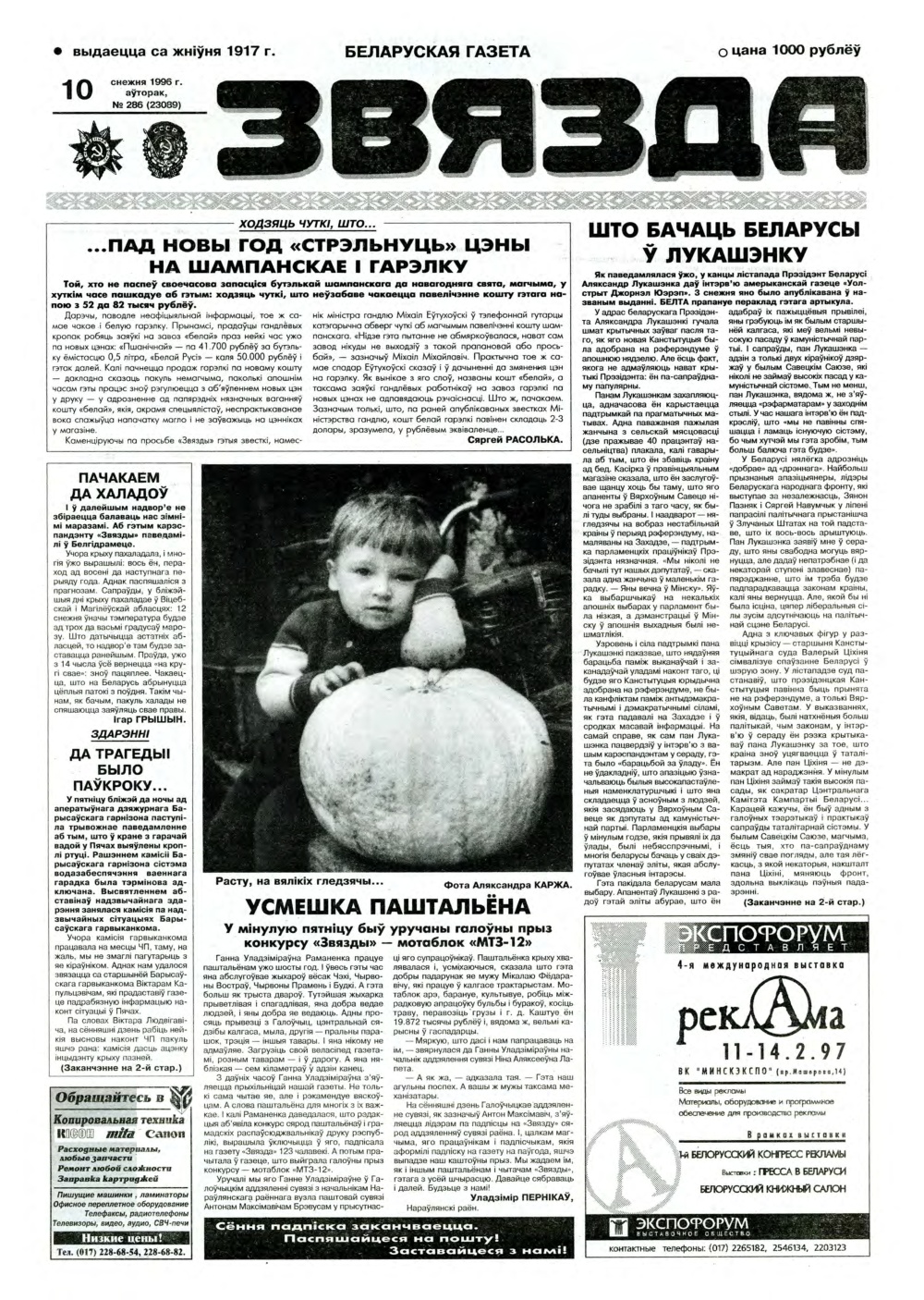 «Звязда» — Беларуская газэта. Выходзіць 250 разоў на год. Аўтары апублікаваных матэрыялаў нясуць адказнасць за падбор і дакладнасць фактаў. Іх меркаванні неабавязкова адлюстроўваюць пункт гледжання рэдакцыі. Болей »