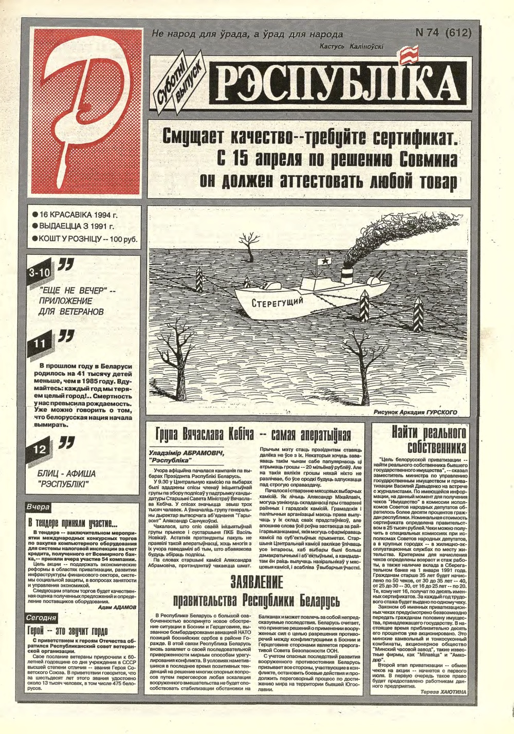 «Рэспубліка» — газета для тых, хто самастойна прымае рашэнні. Заснавальнік - Савет Міністраў Рэспублікі Беларусь. Выдаецца з чэрвеня 1991. Газета выходзіць 250 разоў у год. Аўтары апублікаваных матэрыялаў нясуць адказнасць за падбор і дакладнасць фактаў, іх меркаванні неабавязкова адлюстроўваюць пункт гледжання рэдакцыі. Рукапісы, фотаздымкі і малюнкі не рэцэнзуюцца I не вяртаюцца. Болей »