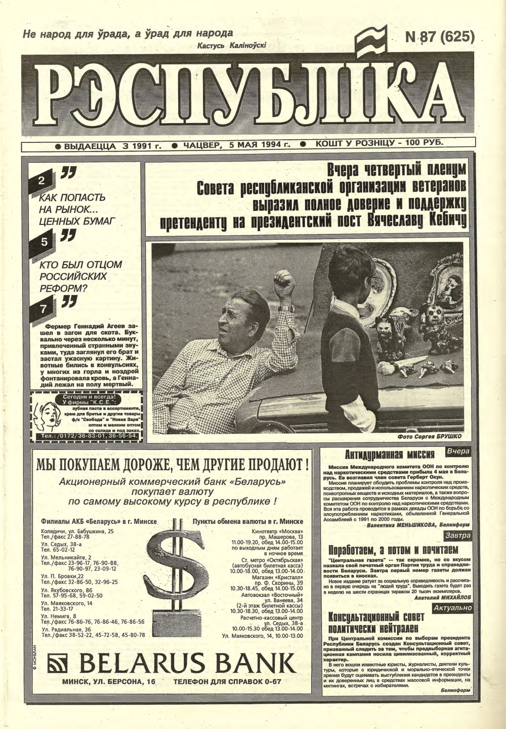 «Рэспубліка» — газета для тых, хто самастойна прымае рашэнні. Заснавальнік - Савет Міністраў Рэспублікі Беларусь. Выдаецца з чэрвеня 1991. Газета выходзіць 250 разоў у год. Аўтары апублікаваных матэрыялаў нясуць адказнасць за падбор і дакладнасць фактаў, іх меркаванні неабавязкова адлюстроўваюць пункт гледжання рэдакцыі. Рукапісы, фотаздымкі і малюнкі не рэцэнзуюцца I не вяртаюцца. More »