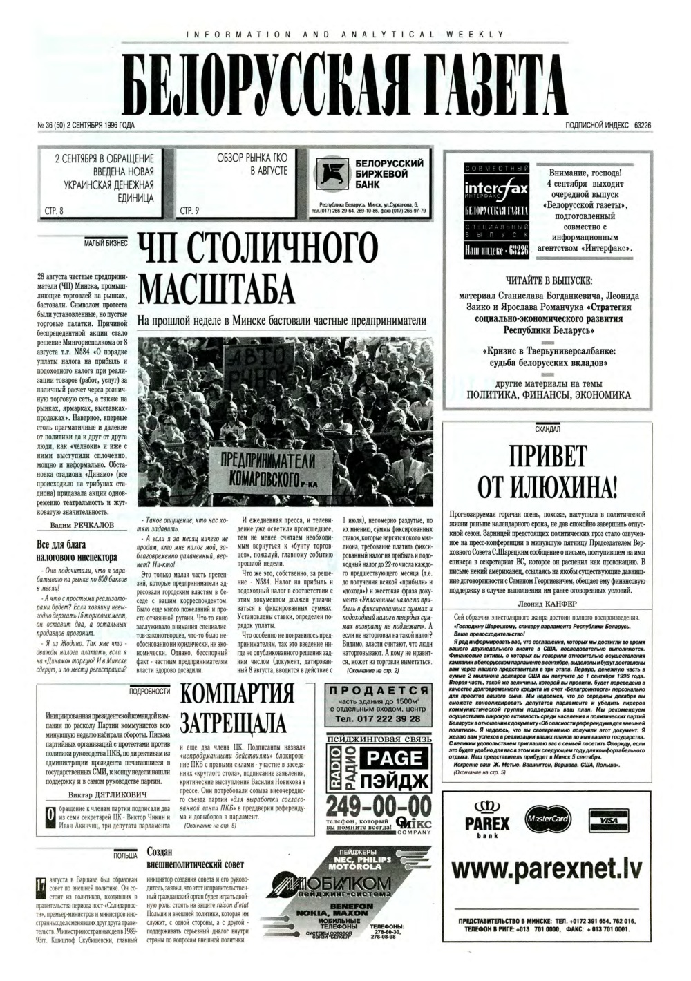 «БелГазета» —інфармацыйна-аналітычная рускамоўная газета, выходзіць штотыдзень у Беларусі. Да верасня 2005 года — «Беларуская газета». Займаецца незалежным асвятленнем падзей эканамічнага, унутрыпалітычнага, дзелавога, культурнага, грамадскага, міжнароднага жыцця Беларусі і блізкага замежжа (Расія, Украіна, краіны Балтыі). Асноўная тэматыка: дзяржава, палітыка, эканоміка, бізнэс, кампаніі і рынкі, грамадства, здарэнні, крымінал, шоу-біз... Болей »