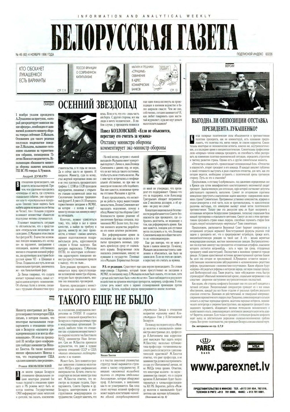 «БелГазета» —інфармацыйна-аналітычная рускамоўная газета, выходзіць штотыдзень у Беларусі. Да верасня 2005 года — «Беларуская газета». Займаецца незалежным асвятленнем падзей эканамічнага, унутрыпалітычнага, дзелавога, культурнага, грамадскага, міжнароднага жыцця Беларусі і блізкага замежжа (Расія, Украіна, краіны Балтыі). Асноўная тэматыка: дзяржава, палітыка, эканоміка, бізнэс, кампаніі і рынкі, грамадства, здарэнні, крымінал, шоу-біз... Болей »