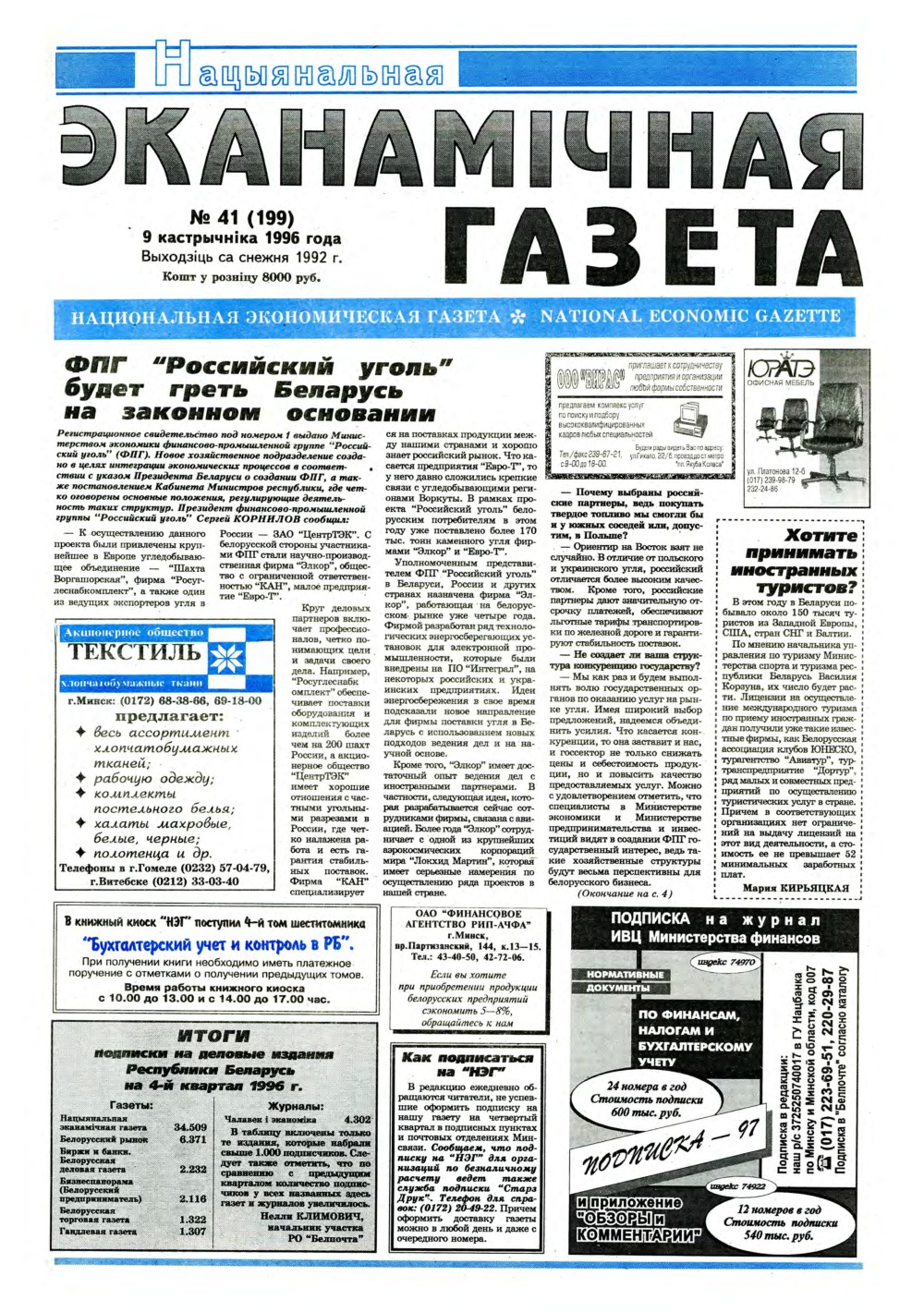 «Нацыянальная эканамічная газета» — «Нацыянальная эканамічная газета» — заснаваная часопісам «Чалавек і эканоміка». Найстарэйшае эканамічнае выданне ў Рэспубліцы Беларусь. Выходзіць са снежня 1992 года. Газета адной з першых узялася за эканамічную адукацыю, выхаванне спецыялістаў новай фармацыі ў перыяд пераходу ад адміністрацыйна-каманднай сістэмы гаспадарання да рынку. Праблемы макраэканомікі і фінансаў, бухгалтарскага ўліку і падатка... Болей »