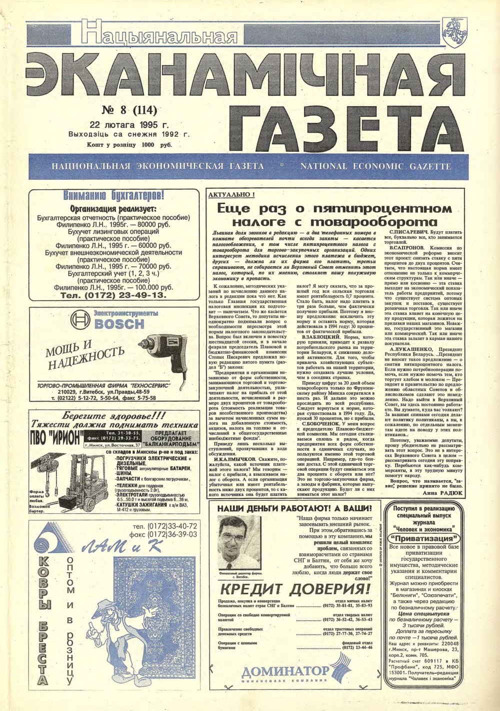 «Нацыянальная эканамічная газета» — «Нацыянальная эканамічная газета» — заснаваная часопісам «Чалавек і эканоміка». Найстарэйшае эканамічнае выданне ў Рэспубліцы Беларусь. Выходзіць са снежня 1992 года. Газета адной з першых узялася за эканамічную адукацыю, выхаванне спецыялістаў новай фармацыі ў перыяд пераходу ад адміністрацыйна-каманднай сістэмы гаспадарання да рынку. Праблемы макраэканомікі і фінансаў, бухгалтарскага ўліку і падатка... Болей »