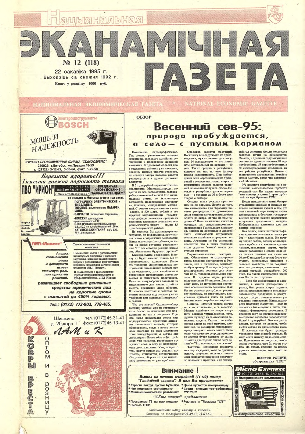 «Нацыянальная эканамічная газета» — «Нацыянальная эканамічная газета» — заснаваная часопісам «Чалавек і эканоміка». Найстарэйшае эканамічнае выданне ў Рэспубліцы Беларусь. Выходзіць са снежня 1992 года. Газета адной з першых узялася за эканамічную адукацыю, выхаванне спецыялістаў новай фармацыі ў перыяд пераходу ад адміністрацыйна-каманднай сістэмы гаспадарання да рынку. Праблемы макраэканомікі і фінансаў, бухгалтарскага ўліку і падатка... Болей »