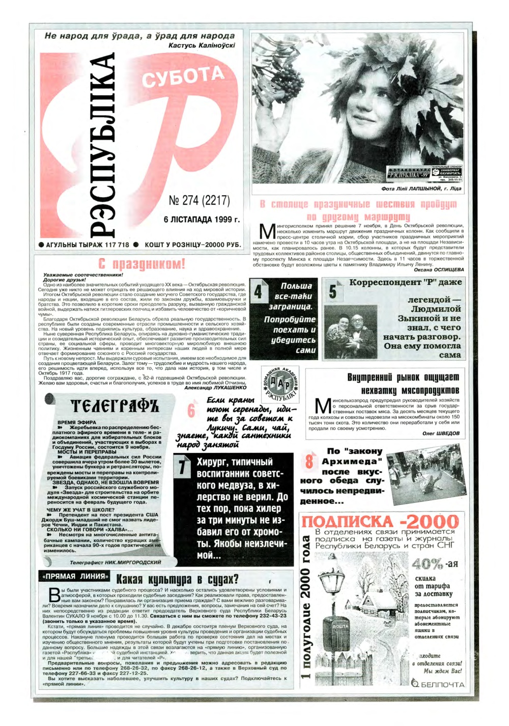 «Рэспубліка» — газета для тых, хто самастойна прымае рашэнні. Заснавальнік - Савет Міністраў Рэспублікі Беларусь. Выдаецца з чэрвеня 1991. Газета выходзіць 250 разоў у год. Аўтары апублікаваных матэрыялаў нясуць адказнасць за падбор і дакладнасць фактаў, іх меркаванні неабавязкова адлюстроўваюць пункт гледжання рэдакцыі. Рукапісы, фотаздымкі і малюнкі не рэцэнзуюцца і не вяртаюцца. Болей »