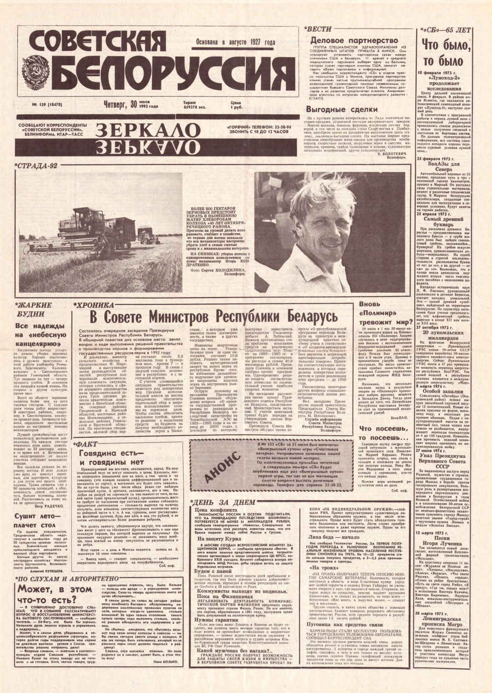 «Советская Белоруссия» — орган Центрального Комитета Коммунистической партии Белоруссии, Верховного Совета и Совета Министров БССР. Белорусская общественно-политическая газета. Издаётся с августа 1927 года. Выходит 5 раз в неделю. Учредители — Администрация президента Республики Беларусь и редакционный совет. На апрель 2019 года тираж — 190 тыс. экземпляров. Крупнейшее печатное СМИ страны. При этом во многих СМИ неоднократно сообщалось ... Болей »