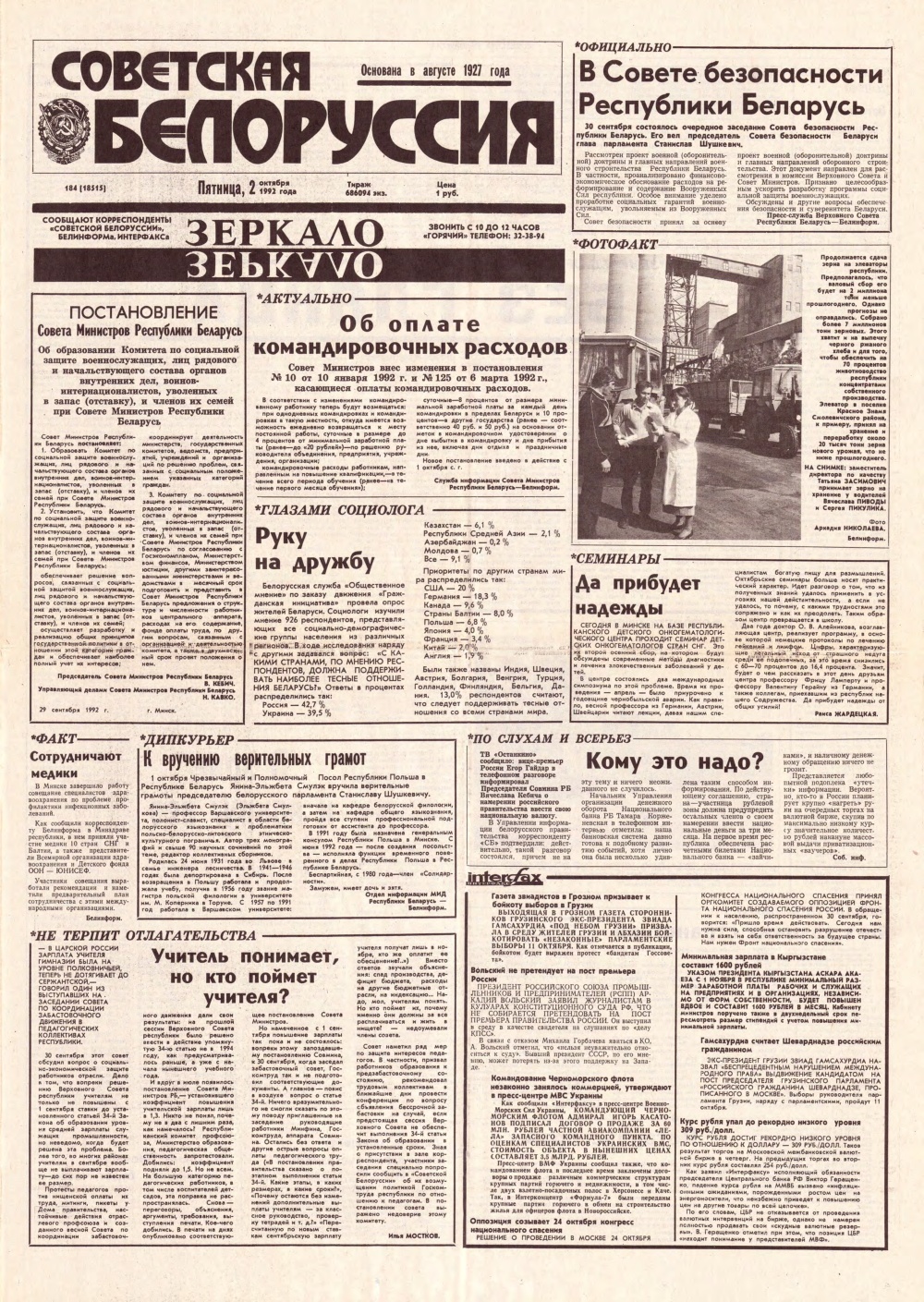«Советская Белоруссия» — орган Центрального Комитета Коммунистической партии Белоруссии, Верховного Совета и Совета Министров БССР. Белорусская общественно-политическая газета. Издаётся с августа 1927 года. Выходит 5 раз в неделю. Учредители — Администрация президента Республики Беларусь и редакционный совет. На апрель 2019 года тираж — 190 тыс. экземпляров. Крупнейшее печатное СМИ страны. При этом во многих СМИ неоднократно сообщалось ... Болей »