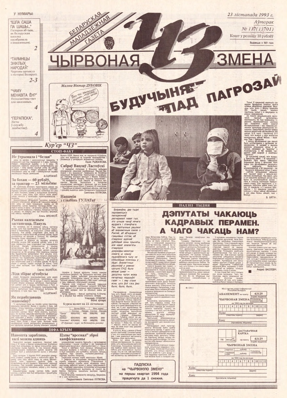 «Чырвоная змена» — беларуская маладзёжная газета. У 1921—2002 гадах з’яўлялася самастойным выданнем. З 2002 года дадатак да газеты «Звязда». З «Чырвонай зменай» ахвотна супрацоўнічаў Уладзімір Караткевіч, тут апублікаваны многія яго вершаваныя творы і эсэ: «Сплятайце рукі», «У тую ноч», «Як стажары ў небе заззялі», «Твой зорны шлях». На старонках газеты была апублікавана і аповесць Васіля Быкава «Жураўліны крык». Болей »