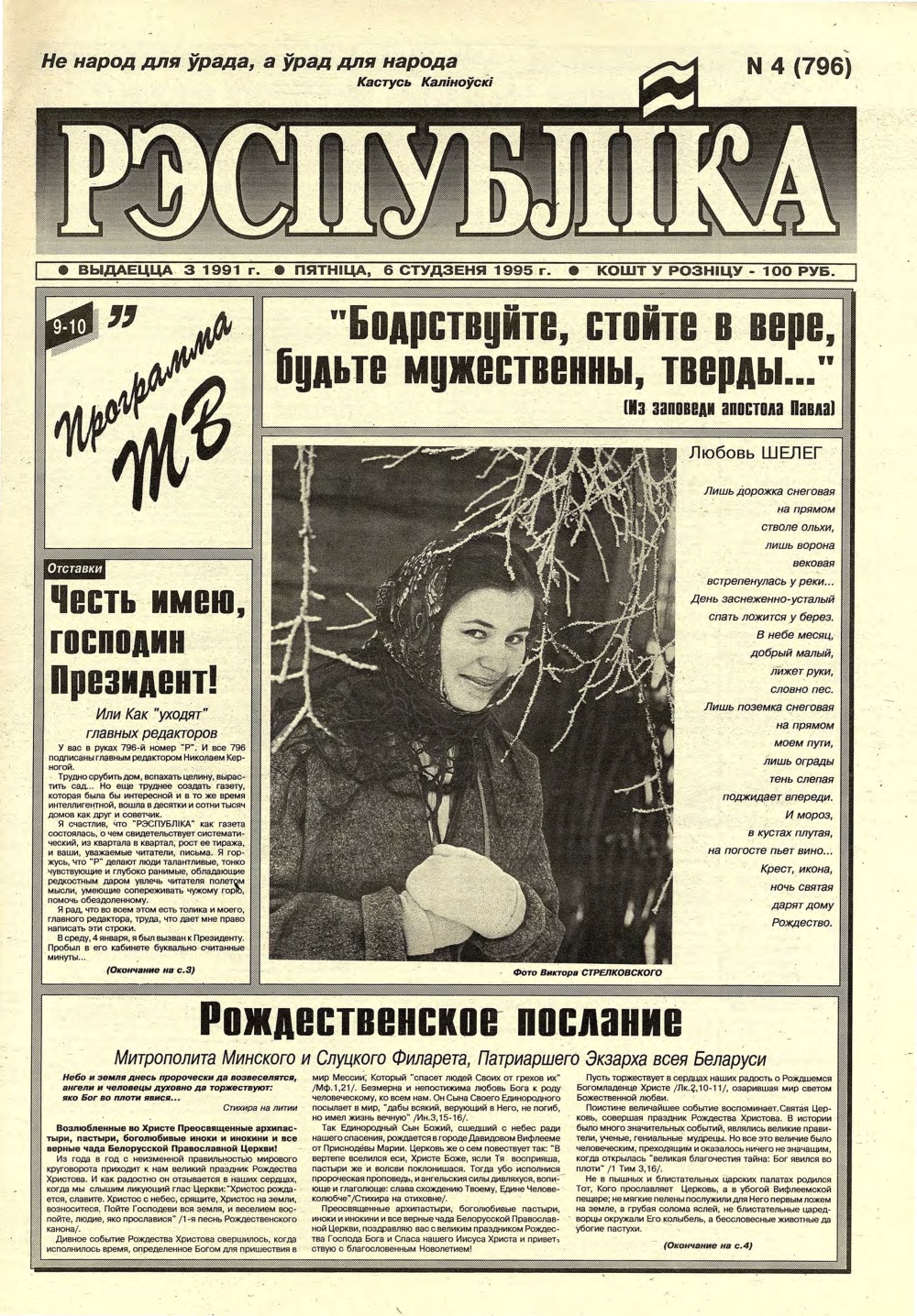 «Рэспубліка» — газета для тых, хто самастойна прымае рашэнні. Заснавальнік - Савет Міністраў Рэспублікі Беларусь. Выдаецца з чэрвеня 1991. Газета выходзіць 250 разоў у год. Аўтары апублікаваных матэрыялаў нясуць адказнасць за падбор і дакладнасць фактаў, іх меркаванні неабавязкова адлюстроўваюць пункт гледжання рэдакцыі. Рукапісы, фотаздымкі і малюнкі не рэцэнзуюцца і не вяртаюцца. Болей »