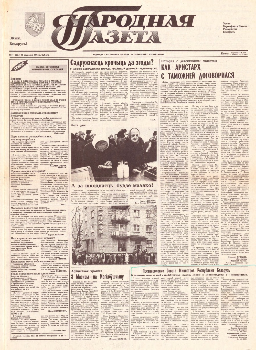 «Народная газета» — орган Вярхоўнага Савета Рэспублікі Беларусь. Выдавец: Адкрытае акцыянернае таварыства Народная газета. Выходзіць штодзённа, акрамя нядзелі і панядзелка, 250 разоў у год. Выдаецца з кастрычніка 1990 года на беларускай і рускай мовах. З 1990 па 1995 год пасаду галоўнага рэдактара «Народнай газеты» займаў Іосіф Сярэдзіч. З мая 1990 па студзень 1996 — дэпутат Вярхоўнага Савета XII склікання. Выданне займала ўмераную цэнт... Болей »