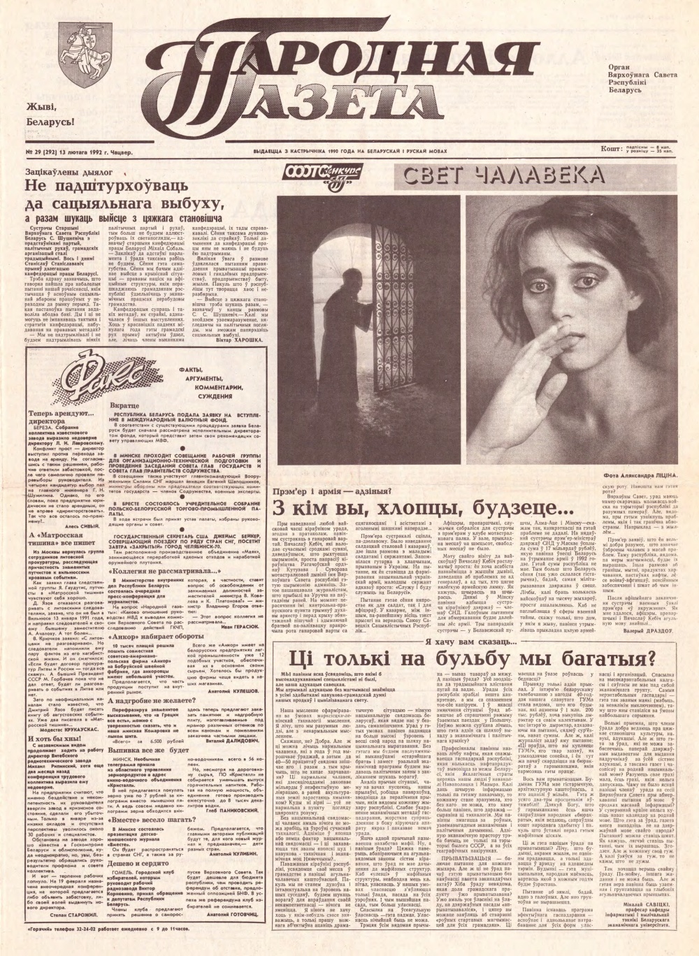«Народная газета» — орган Вярхоўнага Савета Рэспублікі Беларусь. Выдавец: Адкрытае акцыянернае таварыства Народная газета. Выходзіць штодзённа, акрамя нядзелі і панядзелка, 250 разоў у год. Выдаецца з кастрычніка 1990 года на беларускай і рускай мовах. З 1990 па 1995 год пасаду галоўнага рэдактара «Народнай газеты» займаў Іосіф Сярэдзіч. З мая 1990 па студзень 1996 — дэпутат Вярхоўнага Савета XII склікання. Выданне займала ўмераную цэнт... Болей »