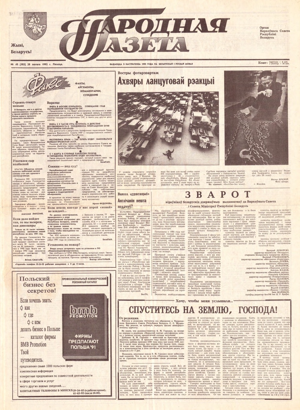 «Народная газета» — орган Вярхоўнага Савета Рэспублікі Беларусь. Выдавец: Адкрытае акцыянернае таварыства Народная газета. Выходзіць штодзённа, акрамя нядзелі і панядзелка, 250 разоў у год. Выдаецца з кастрычніка 1990 года на беларускай і рускай мовах. З 1990 па 1995 год пасаду галоўнага рэдактара «Народнай газеты» займаў Іосіф Сярэдзіч. З мая 1990 па студзень 1996 — дэпутат Вярхоўнага Савета XII склікання. Выданне займала ўмераную цэнт... Болей »