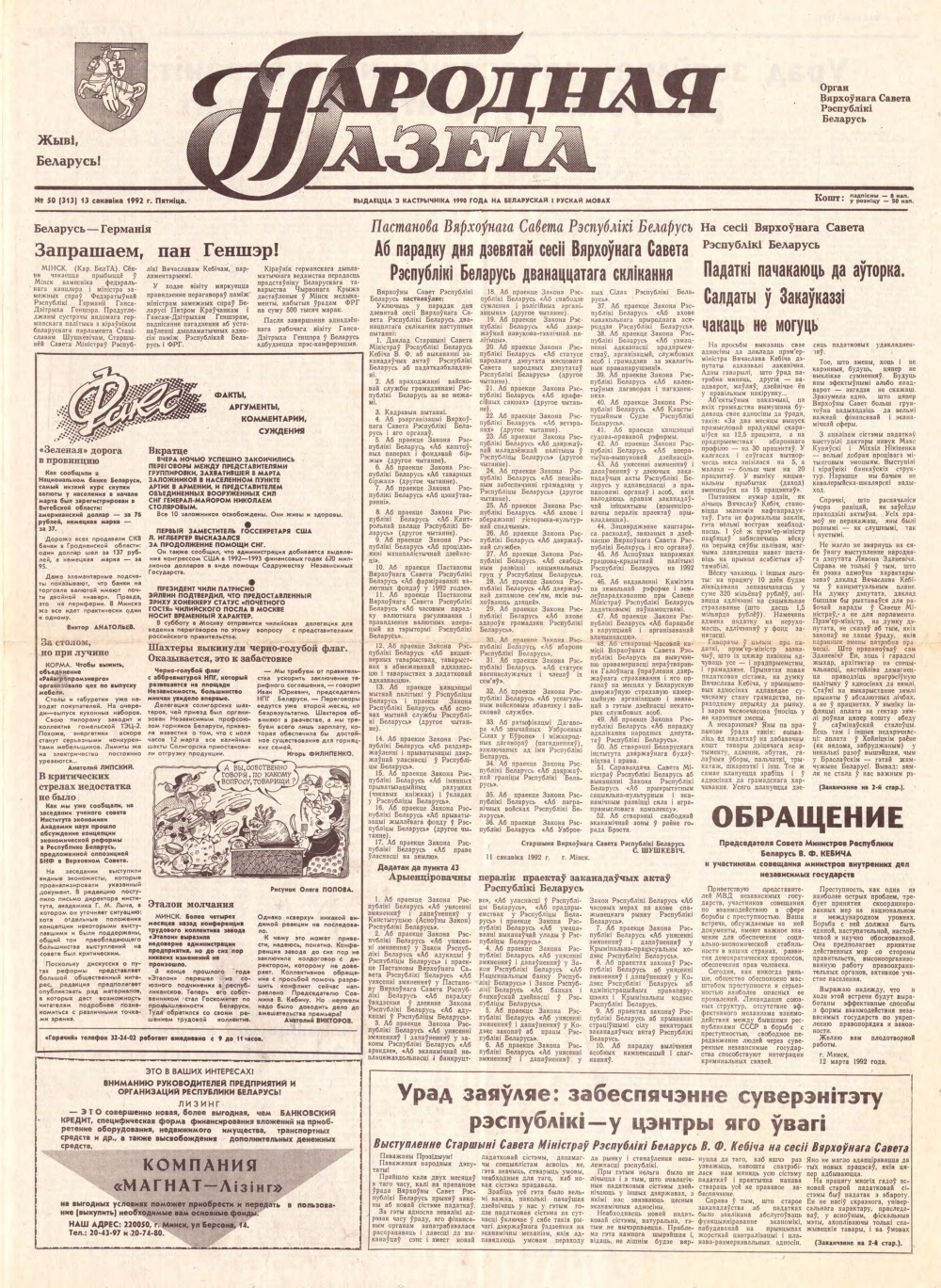 «Народная газета» — орган Вярхоўнага Савета Рэспублікі Беларусь. Выдавец: Адкрытае акцыянернае таварыства Народная газета. Выходзіць штодзённа, акрамя нядзелі і панядзелка, 250 разоў у год. Выдаецца з кастрычніка 1990 года на беларускай і рускай мовах. З 1990 па 1995 год пасаду галоўнага рэдактара «Народнай газеты» займаў Іосіф Сярэдзіч. З мая 1990 па студзень 1996 — дэпутат Вярхоўнага Савета XII склікання. Выданне займала ўмераную цэнт... Болей »