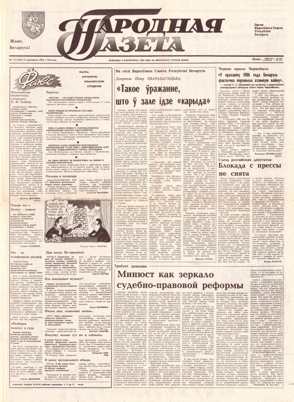 «Народная газета» — орган Вярхоўнага Савета Рэспублікі Беларусь. Выдавец: Адкрытае акцыянернае таварыства Народная газета. Выходзіць штодзённа, акрамя нядзелі і панядзелка, 250 разоў у год. Выдаецца з кастрычніка 1990 года на беларускай і рускай мовах. З 1990 па 1995 год пасаду галоўнага рэдактара «Народнай газеты» займаў Іосіф Сярэдзіч. З мая 1990 па студзень 1996 — дэпутат Вярхоўнага Савета XII склікання. Выданне займала ўмераную цэнт... Болей »