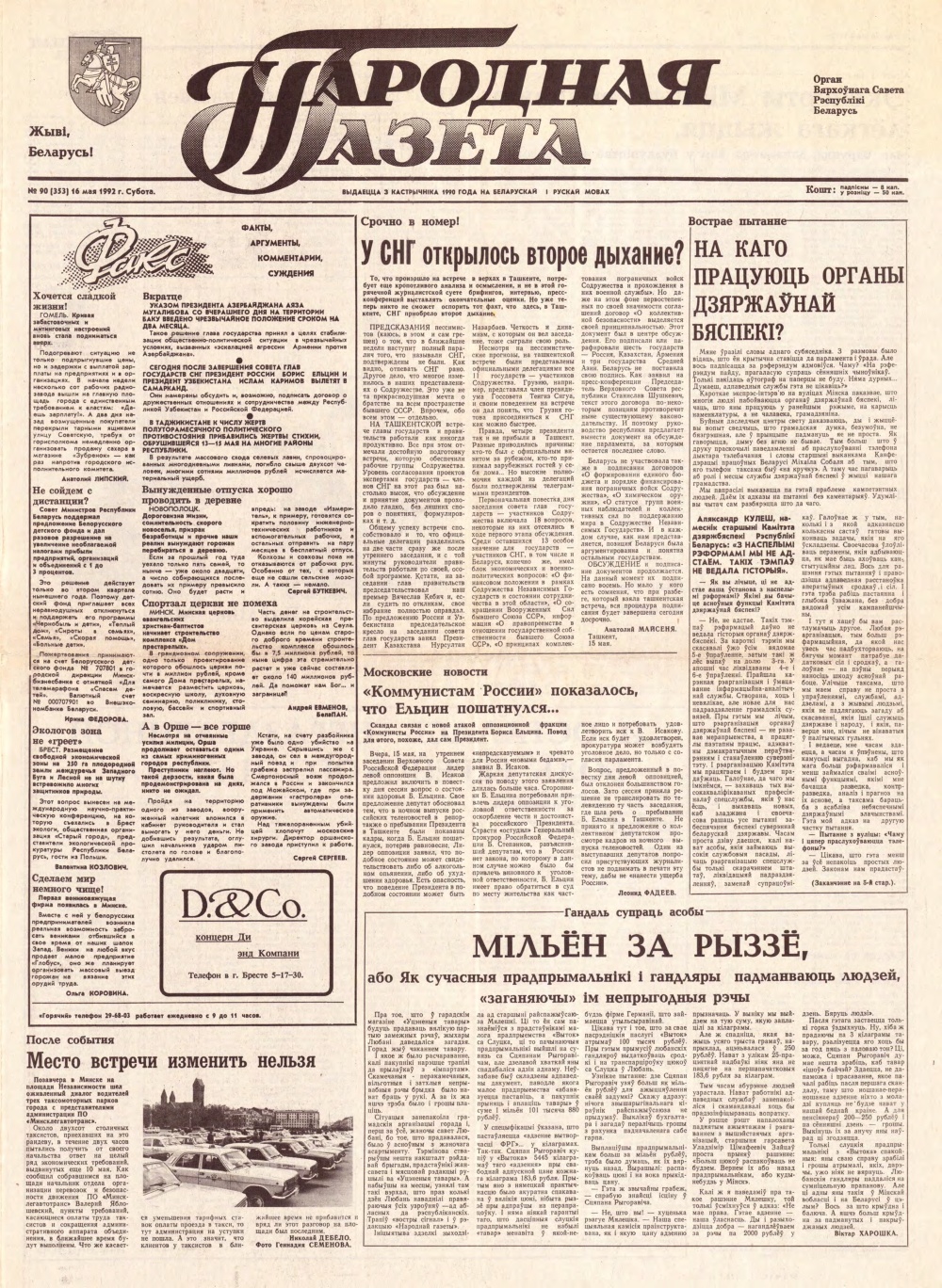 «Народная газета» — орган Вярхоўнага Савета Рэспублікі Беларусь. Выдавец: Адкрытае акцыянернае таварыства Народная газета. Выходзіць штодзённа, акрамя нядзелі і панядзелка, 250 разоў у год. Выдаецца з кастрычніка 1990 года на беларускай і рускай мовах. З 1990 па 1995 год пасаду галоўнага рэдактара «Народнай газеты» займаў Іосіф Сярэдзіч. З мая 1990 па студзень 1996 — дэпутат Вярхоўнага Савета XII склікання. Выданне займала ўмераную цэнт... Болей »
