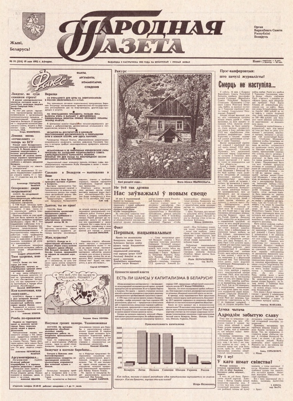 «Народная газета» — орган Вярхоўнага Савета Рэспублікі Беларусь. Выдавец: Адкрытае акцыянернае таварыства Народная газета. Выходзіць штодзённа, акрамя нядзелі і панядзелка, 250 разоў у год. Выдаецца з кастрычніка 1990 года на беларускай і рускай мовах. З 1990 па 1995 год пасаду галоўнага рэдактара «Народнай газеты» займаў Іосіф Сярэдзіч. З мая 1990 па студзень 1996 — дэпутат Вярхоўнага Савета XII склікання. Выданне займала ўмераную цэнт... Болей »