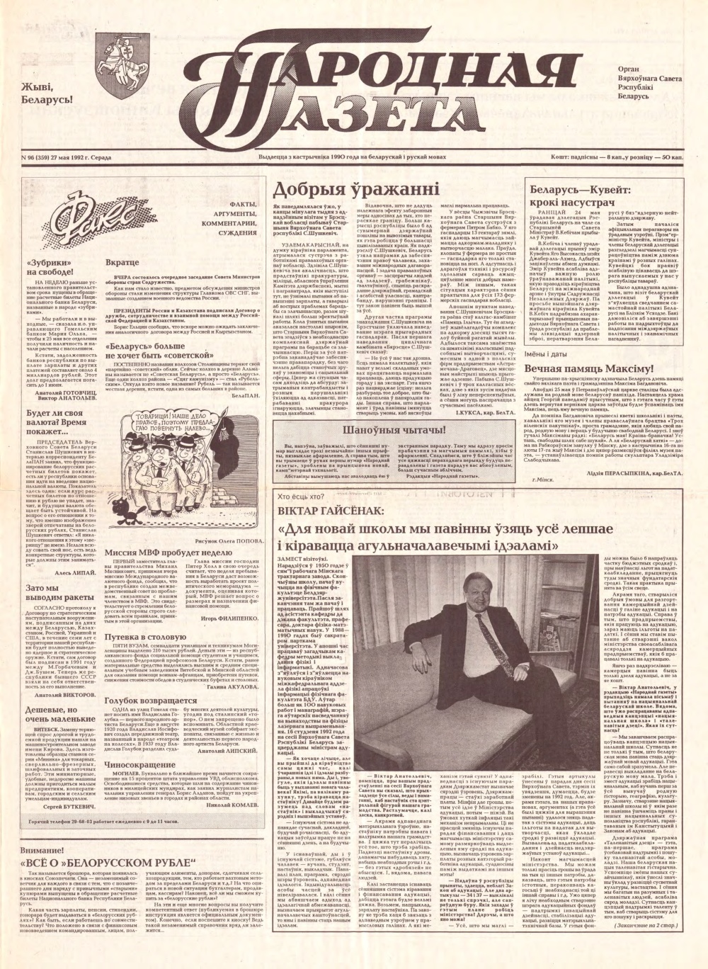 «Народная газета» — орган Вярхоўнага Савета Рэспублікі Беларусь. Выдавец: Адкрытае акцыянернае таварыства Народная газета. Выходзіць штодзённа, акрамя нядзелі і панядзелка, 250 разоў у год. Выдаецца з кастрычніка 1990 года на беларускай і рускай мовах. З 1990 па 1995 год пасаду галоўнага рэдактара «Народнай газеты» займаў Іосіф Сярэдзіч. З мая 1990 па студзень 1996 — дэпутат Вярхоўнага Савета XII склікання. Выданне займала ўмераную цэнт... Болей »