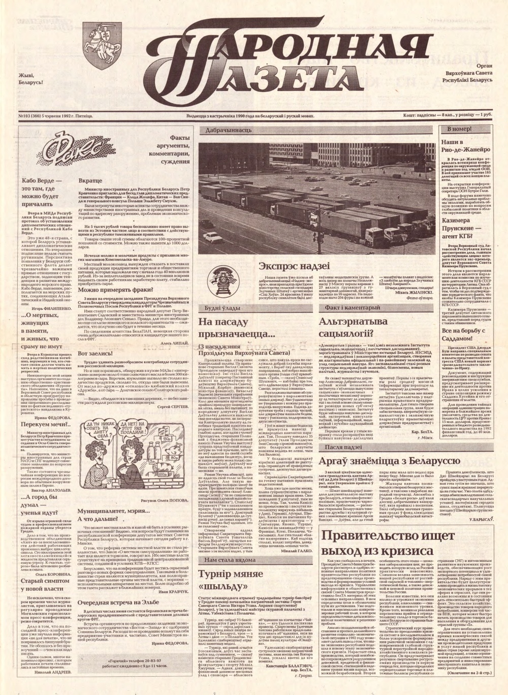 «Народная газета» — орган Вярхоўнага Савета Рэспублікі Беларусь. Выдавец: Адкрытае акцыянернае таварыства Народная газета. Выходзіць штодзённа, акрамя нядзелі і панядзелка, 250 разоў у год. Выдаецца з кастрычніка 1990 года на беларускай і рускай мовах. З 1990 па 1995 год пасаду галоўнага рэдактара «Народнай газеты» займаў Іосіф Сярэдзіч. З мая 1990 па студзень 1996 — дэпутат Вярхоўнага Савета XII склікання. Выданне займала ўмераную цэнт... Болей »