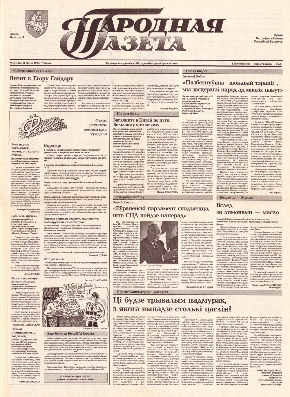 «Народная газета» — орган Вярхоўнага Савета Рэспублікі Беларусь. Выдавец: Адкрытае акцыянернае таварыства Народная газета. Выходзіць штодзённа, акрамя нядзелі і панядзелка, 250 разоў у год. Выдаецца з кастрычніка 1990 года на беларускай і рускай мовах. З 1990 па 1995 год пасаду галоўнага рэдактара «Народнай газеты» займаў Іосіф Сярэдзіч. З мая 1990 па студзень 1996 — дэпутат Вярхоўнага Савета XII склікання. Выданне займала ўмераную цэнт... Болей »
