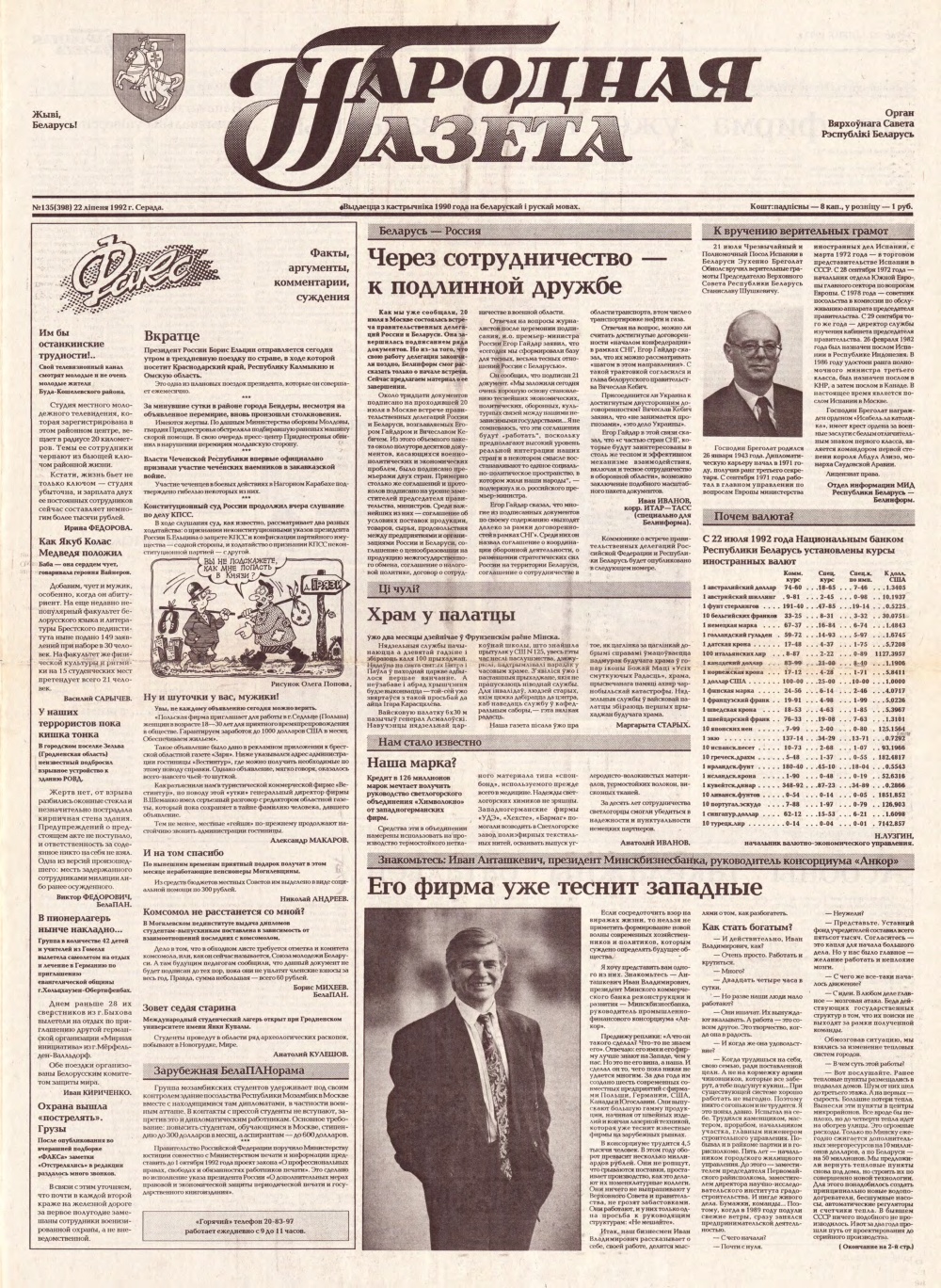 «Народная газета» — орган Вярхоўнага Савета Рэспублікі Беларусь. Выдавец: Адкрытае акцыянернае таварыства Народная газета. Выходзіць штодзённа, акрамя нядзелі і панядзелка, 250 разоў у год. Выдаецца з кастрычніка 1990 года на беларускай і рускай мовах. З 1990 па 1995 год пасаду галоўнага рэдактара «Народнай газеты» займаў Іосіф Сярэдзіч. З мая 1990 па студзень 1996 — дэпутат Вярхоўнага Савета XII склікання. Выданне займала ўмераную цэнт... Болей »