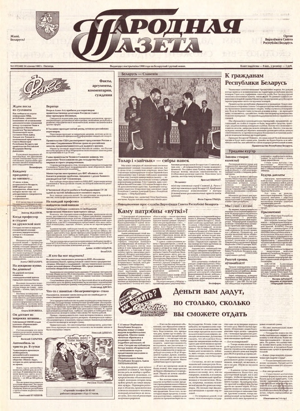 «Народная газета» — орган Вярхоўнага Савета Рэспублікі Беларусь. Выдавец: Адкрытае акцыянернае таварыства Народная газета. Выходзіць штодзённа, акрамя нядзелі і панядзелка, 250 разоў у год. Выдаецца з кастрычніка 1990 года на беларускай і рускай мовах. З 1990 па 1995 год пасаду галоўнага рэдактара «Народнай газеты» займаў Іосіф Сярэдзіч. З мая 1990 па студзень 1996 — дэпутат Вярхоўнага Савета XII склікання. Выданне займала ўмераную цэнт... Болей »
