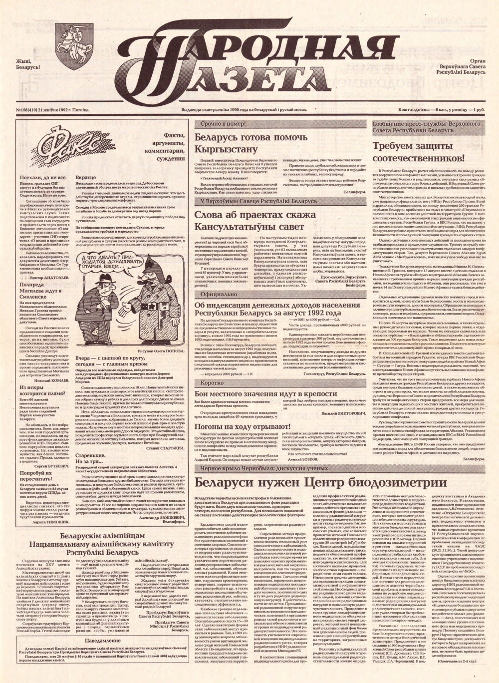 «Народная газета» — орган Вярхоўнага Савета Рэспублікі Беларусь. Выдавец: Адкрытае акцыянернае таварыства Народная газета. Выходзіць штодзённа, акрамя нядзелі і панядзелка, 250 разоў у год. Выдаецца з кастрычніка 1990 года на беларускай і рускай мовах. З 1990 па 1995 год пасаду галоўнага рэдактара «Народнай газеты» займаў Іосіф Сярэдзіч. З мая 1990 па студзень 1996 — дэпутат Вярхоўнага Савета XII склікання. Выданне займала ўмераную цэнт... Болей »