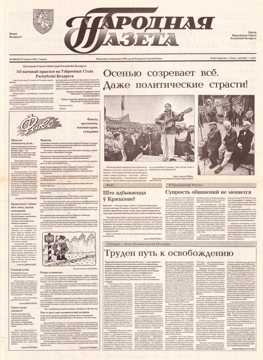 «Народная газета» — орган Вярхоўнага Савета Рэспублікі Беларусь. Выдавец: Адкрытае акцыянернае таварыства Народная газета. Выходзіць штодзённа, акрамя нядзелі і панядзелка, 250 разоў у год. Выдаецца з кастрычніка 1990 года на беларускай і рускай мовах. З 1990 па 1995 год пасаду галоўнага рэдактара «Народнай газеты» займаў Іосіф Сярэдзіч. З мая 1990 па студзень 1996 — дэпутат Вярхоўнага Савета XII склікання. Выданне займала ўмераную цэнт... Болей »