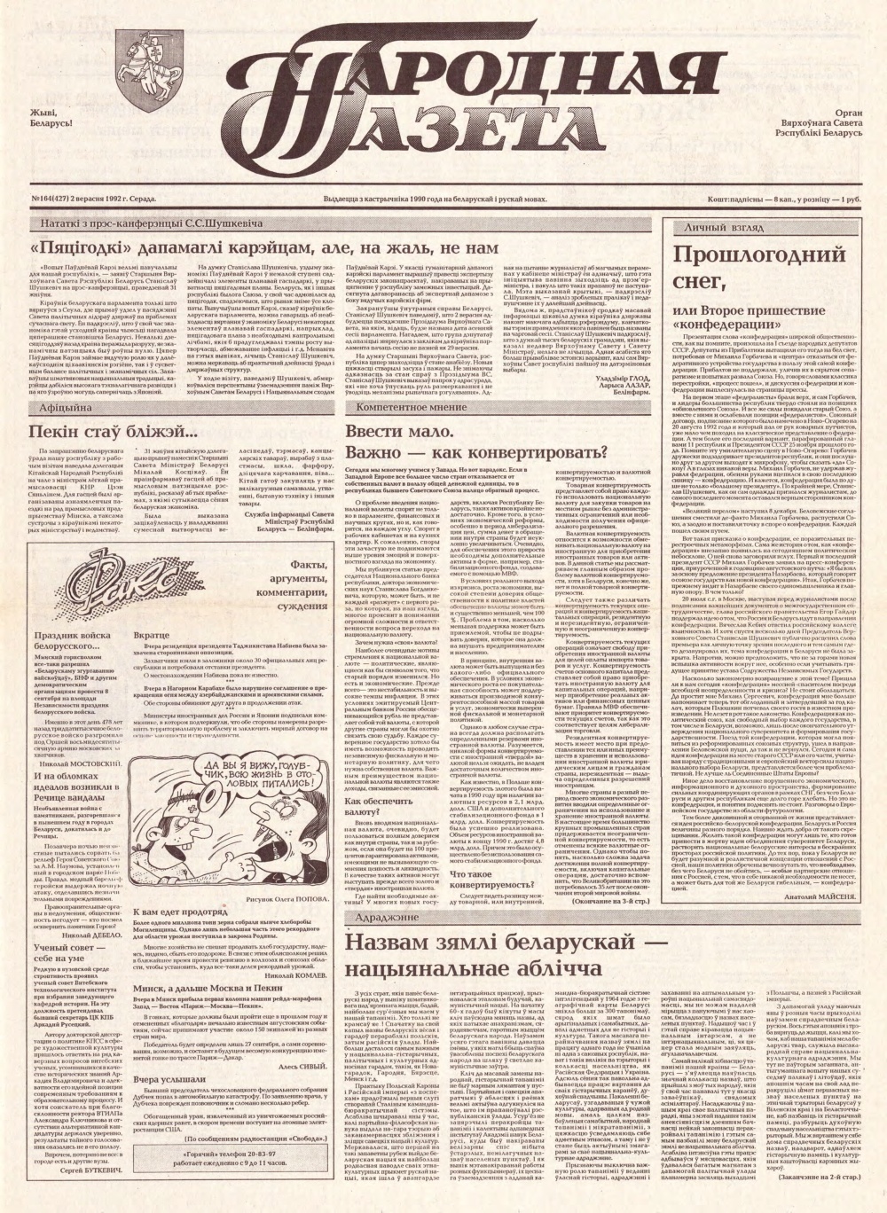 «Народная газета» — орган Вярхоўнага Савета Рэспублікі Беларусь. Выдавец: Адкрытае акцыянернае таварыства Народная газета. Выходзіць штодзённа, акрамя нядзелі і панядзелка, 250 разоў у год. Выдаецца з кастрычніка 1990 года на беларускай і рускай мовах. З 1990 па 1995 год пасаду галоўнага рэдактара «Народнай газеты» займаў Іосіф Сярэдзіч. З мая 1990 па студзень 1996 — дэпутат Вярхоўнага Савета XII склікання. Выданне займала ўмераную цэнт... Болей »