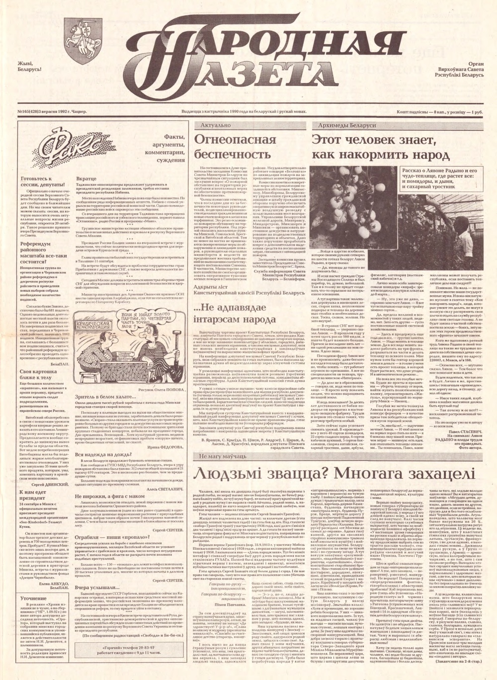 «Народная газета» — орган Вярхоўнага Савета Рэспублікі Беларусь. Выдавец: Адкрытае акцыянернае таварыства Народная газета. Выходзіць штодзённа, акрамя нядзелі і панядзелка, 250 разоў у год. Выдаецца з кастрычніка 1990 года на беларускай і рускай мовах. З 1990 па 1995 год пасаду галоўнага рэдактара «Народнай газеты» займаў Іосіф Сярэдзіч. З мая 1990 па студзень 1996 — дэпутат Вярхоўнага Савета XII склікання. Выданне займала ўмераную цэнт... Болей »