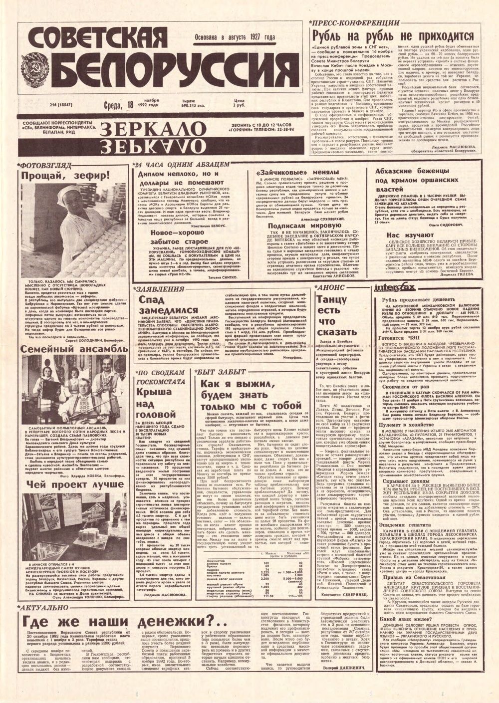 «Советская Белоруссия» — орган Центрального Комитета Коммунистической партии Белоруссии, Верховного Совета и Совета Министров БССР. Белорусская общественно-политическая газета. Издаётся с августа 1927 года. Выходит 5 раз в неделю. Учредители — Администрация президента Республики Беларусь и редакционный совет. На апрель 2019 года тираж — 190 тыс. экземпляров. Крупнейшее печатное СМИ страны. При этом во многих СМИ неоднократно сообщалось ... Болей »